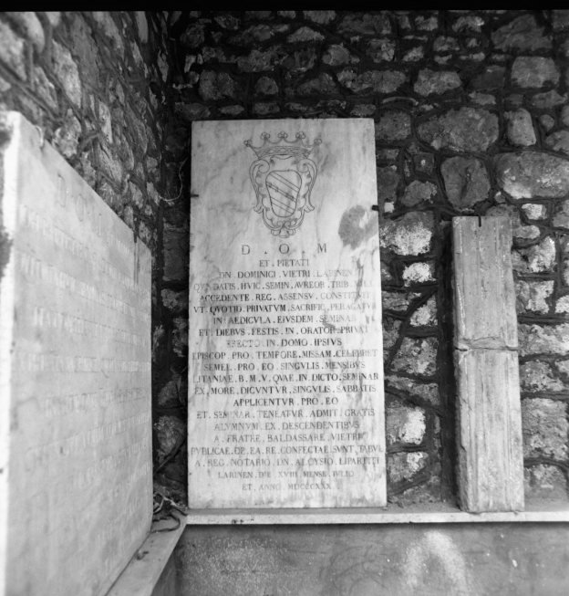 - ISCRIZIONI sulla lapide - D.O.M./ ET PIETATI/ DN DOMINICI VIETRI LARINEN/ QUI DATIS HUIC SEMIN. AUREOR. TRIB. MILL/ ACCEDENTE REG. ASSENSU COSTITUIT/ UT QUOTID. PRIVATUM SACRIFIC. PERAGATUR/ IN AEDICULA EIUSDEM SEMINAR/ ET DIEBUS FESTIS IN ORATOR PRIVAT/ ERECTO IN DOMO IPSIUS/ EPISCOP PRO TEMPORE MISSAM CELEBRET/ SEMEL PRO EO SINGULIS MENSIBUS/ LITANIAE B.M.V. QUAE IN DICTO SEMINAR/ EX MORE DICUNTUR SINGULIS SABBATIS/ APPLICENTUR PRO EO/ ET SEMINAR TENEATUR ADMIT GRATIS/ ALUMNUM EX DESCENDITIBUS/ A FRATRE BALDASSARRE VIETRIE/ PUBLICAE DE EA RE CONFECTAE SUNT TABUL/A REG. NOTARIO DN ALOYSIO LIPARTITI/ LARINEN DIE XVIII MENSE IULIO/ ET ANNO MDCCCXXX - lettere capitali - a incisione -