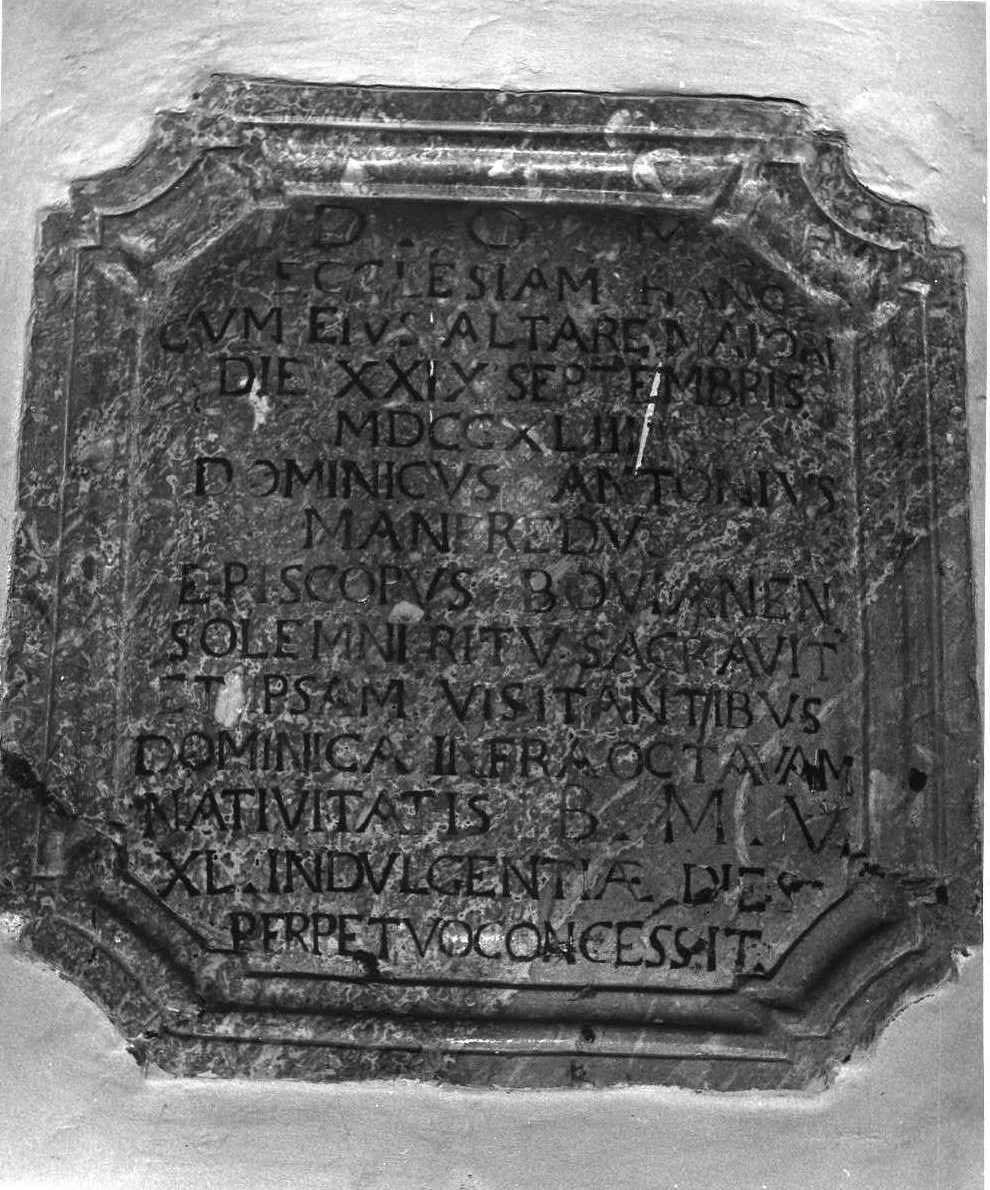 - ISCRIZIONI D.O.M./ ECCLESIAM HANC/ CUM EIUS ALTARE MAIORI/ DIE XXIX SEPTEMBRIS/ MDCCXLIII/ DOMINICUS ANTONIUS/ MANFREDUS/ EPISCOPUS BOVIANEM/ SOLEMNI RITU SACRAVIT/ ET IPSAM VISITANTIBUS/ DOMINICA INFRA OSTAVAM/ NATIVITATIS B.M.V./ XL. INDULGENTIAE/ PERPETUO CONCESSIT - lettere capitali -