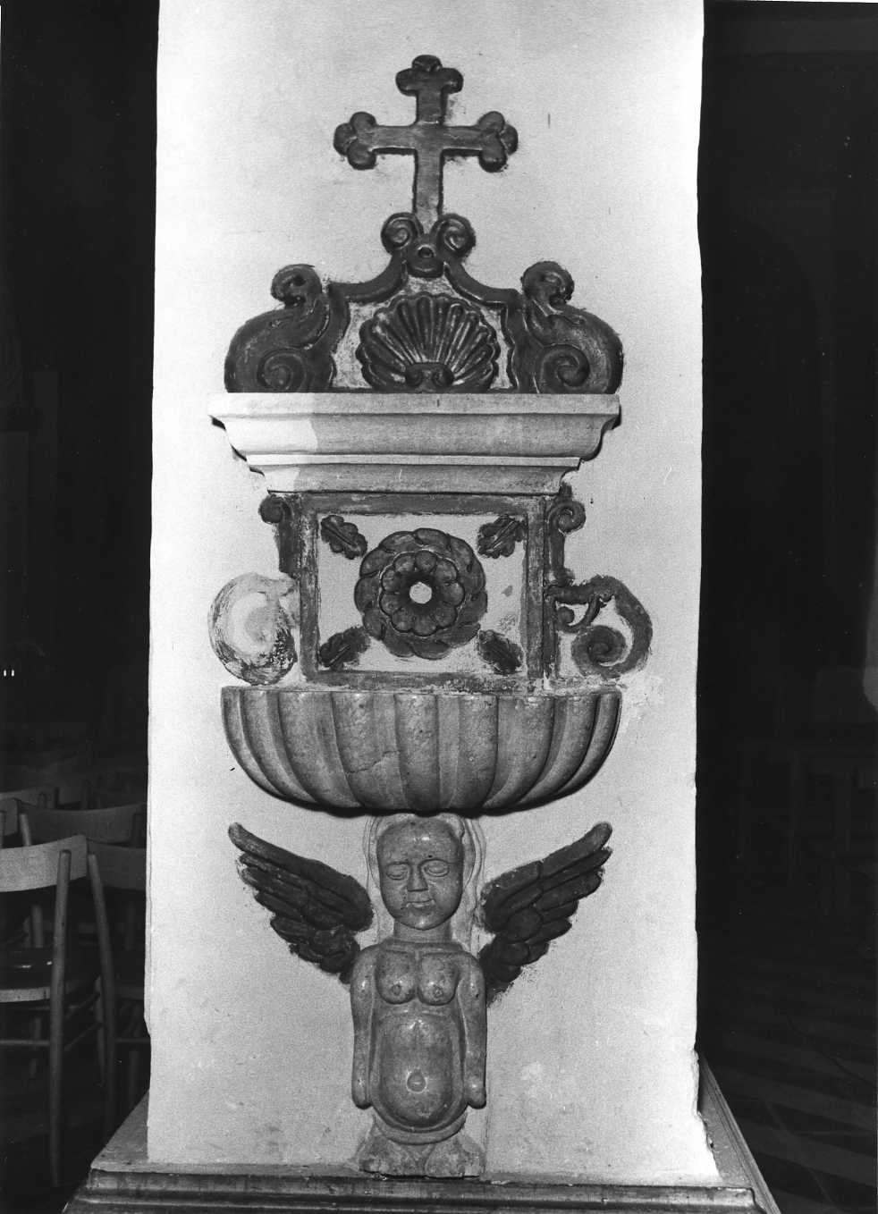Una mezza figura di angelo in rilievo, sorgente dal plinto del pilastro cui l'acquasantiera è adossata, sostiene la conca aggettante, sagomata da una baccellatura a conchiglia, sormontata da ornati in stucco dipinto e dorato (volute, cornici, elementi vegetali) conclusi da una cornice.acquasantiera