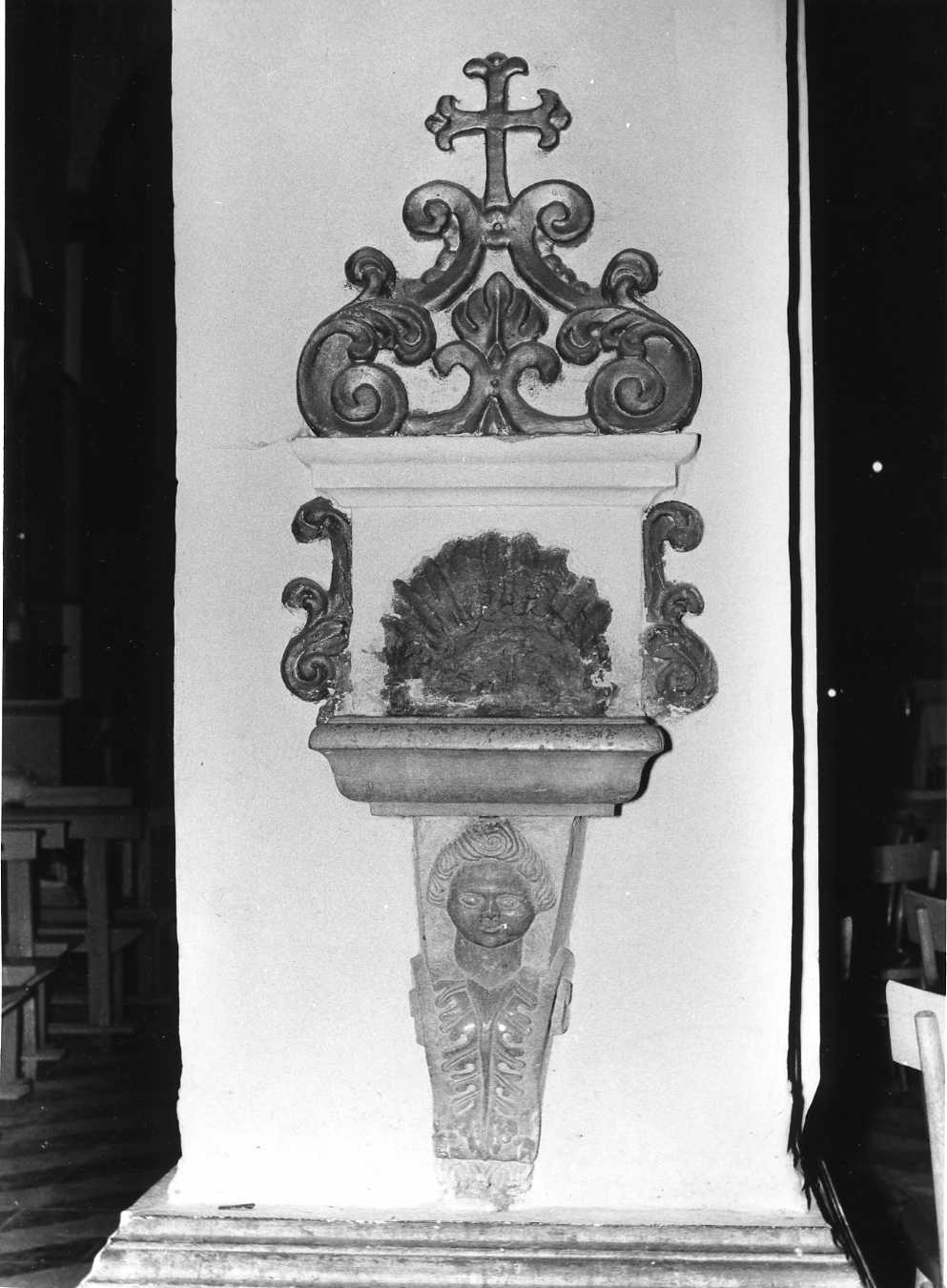 Una conca rettangolare con profili a gola rovescia è sostenuta da un peduccio intagliato in forma di foglia arricciata nella parte superiore dalla quale emerge una testa ricciuta a rilievo. Sopra la conca sono vari motivi di ornato in stucco (una conchiglia, volute vegetali, una croce terminale)