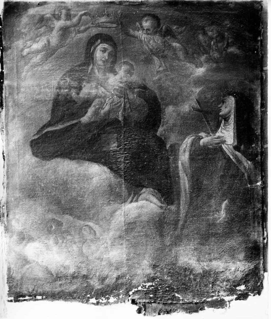 La Madonna è raffigurata su una nube, avvolta nel manto, con il Bambino in braccio, circondata da angeli che la incoronano; sulla destra una santa, in ambiti francescani con il crocifisso in mano; sulla sinistra delle anime oranti