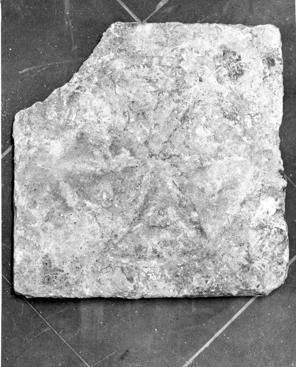 Frammento marmoreo, in pietra locale, raffigura una girandola a sei punte inscritta entro un cerchio