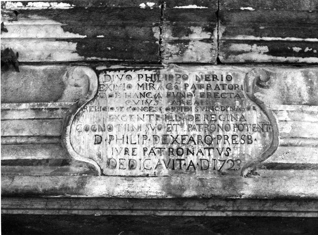 - ISCRIZIONI sul portale esterno - DIVO PHILIPPO NERIO/ EXIMIO MIRAC+ PATRATORI/ AEDE HANC A FUND ERECTA/ CUIUS AREAM/ RELIGIOSE CONCESS OPPIDI S. VINC. DYNASTE/ EX GENTE ILL DE REGINA/ COGNOMINI SUO ET PATRONO POTENT./ D. PHILIP. S DEXEARO PRESB./ IURE PATRONATUS/ DEDICAVIT. A. D. 1723 - lettere capitali - latino