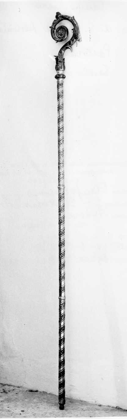 L'asta è percorsa da una fascia includente un motivo cesellato a foglie. Il riccio, che si conclude in un fiore, presenta una testa cherubica