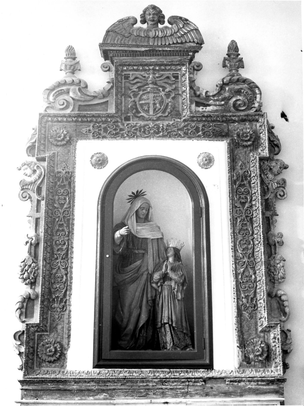- NOTIZIE STORICO CRITICHE L'opera dalla tipologia pienamente barocca, come denunciano i motivi ornamentali, esprime il gusto per una decorazione fitta, memore di partiti decorativi ancora cinquecenteschi, resi con una plastica grossolana tipicamente provinciale. Queste ragioni inducono a riferire la cornice ad artefice locale e a datarla verso la metà del XVII secolo; considerata anche l'istallazione successiva (1742) dell'altare marmoreo (cfr. E. CODA, in AA. VV., 1982, p. 132, fig. 171)