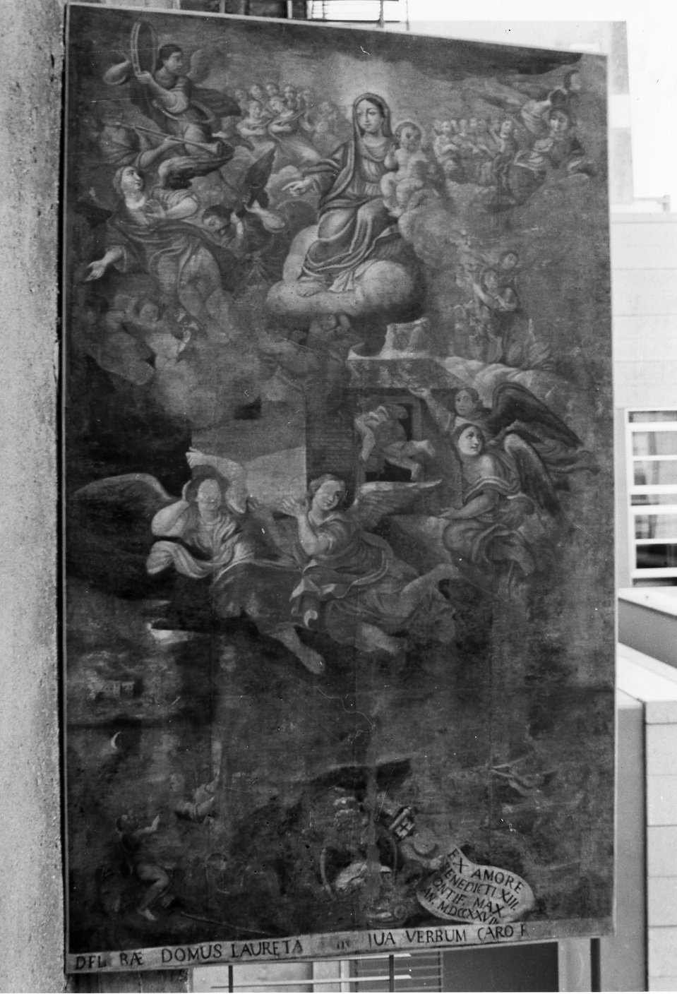 In alto è la Madonna con il Bambino, più in basso alcuni angeli sostengono alcuni angeli sostengono la Santa Casa. La parte inferiore del dipinto è scomparsa quasi completamente (la tela è strappata e presenta vaste lacune)