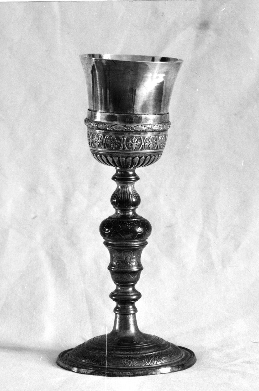 Su un fusto di ottone, con nodo piriforme ornato come la base circolare con motivi incisi, si innesta il sottocoppa baccellato con fregio di fogliette e ghirlanda. Sulla coppa è visibile una crocetta