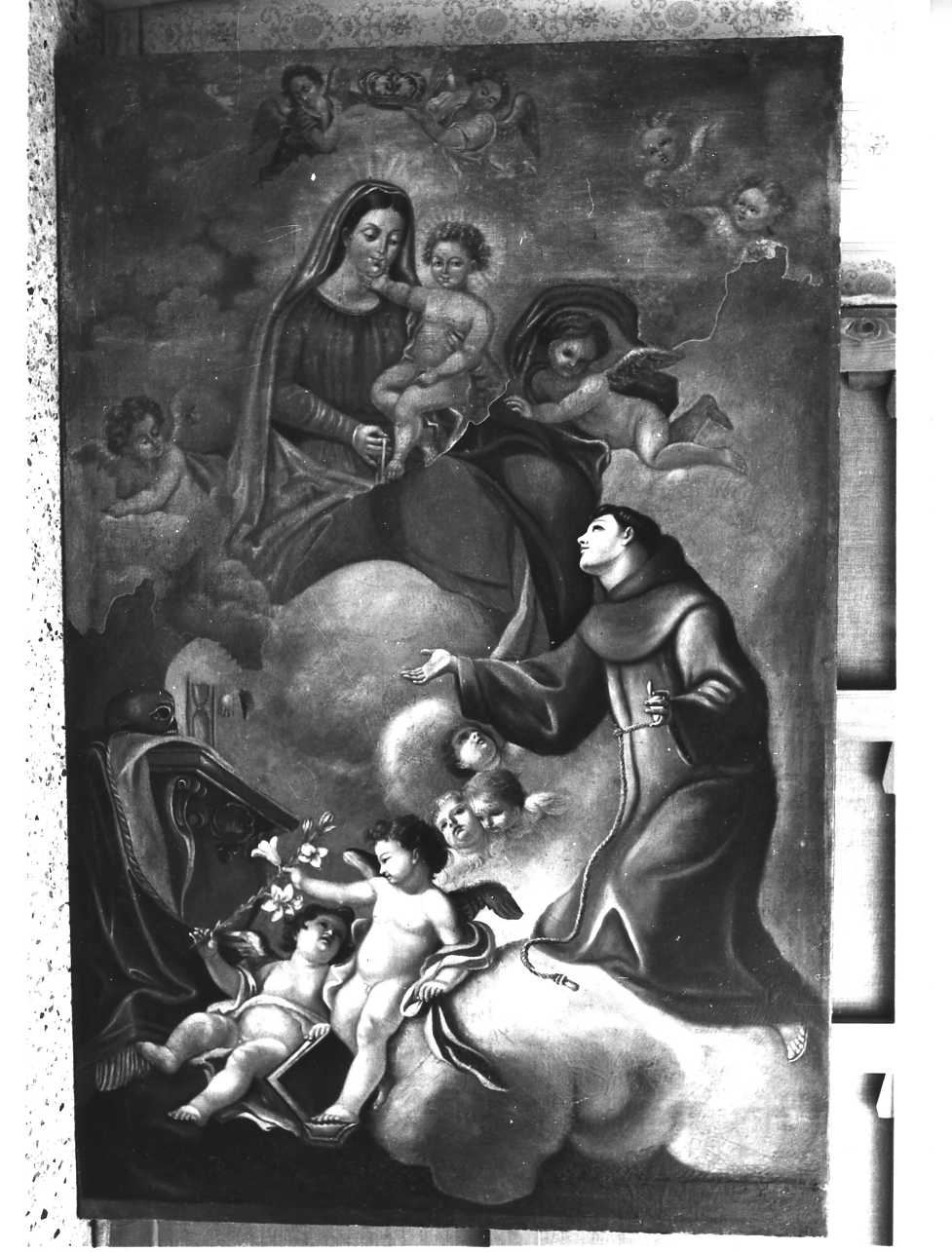 Il dipinto raffigura la Madonna seduta sulle nuvole col Bambino in braccio. Con la mano destra p orge a S. Antonio da Padova il cinto del Carmelo. Numerosi angioletti cont rornano la scena, due dei quali recano i simboli del Santo