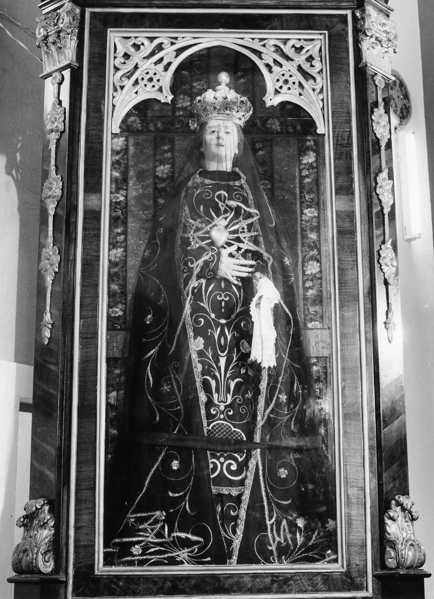 Statua raffigurante la Vergine, velata e incoronata, vestita con un abito di raso nero con ricami d'oro che formano motivi decorativi floreali ed a volute al centro dei quali e' visibile un cuore di metallo argentato con sette spade