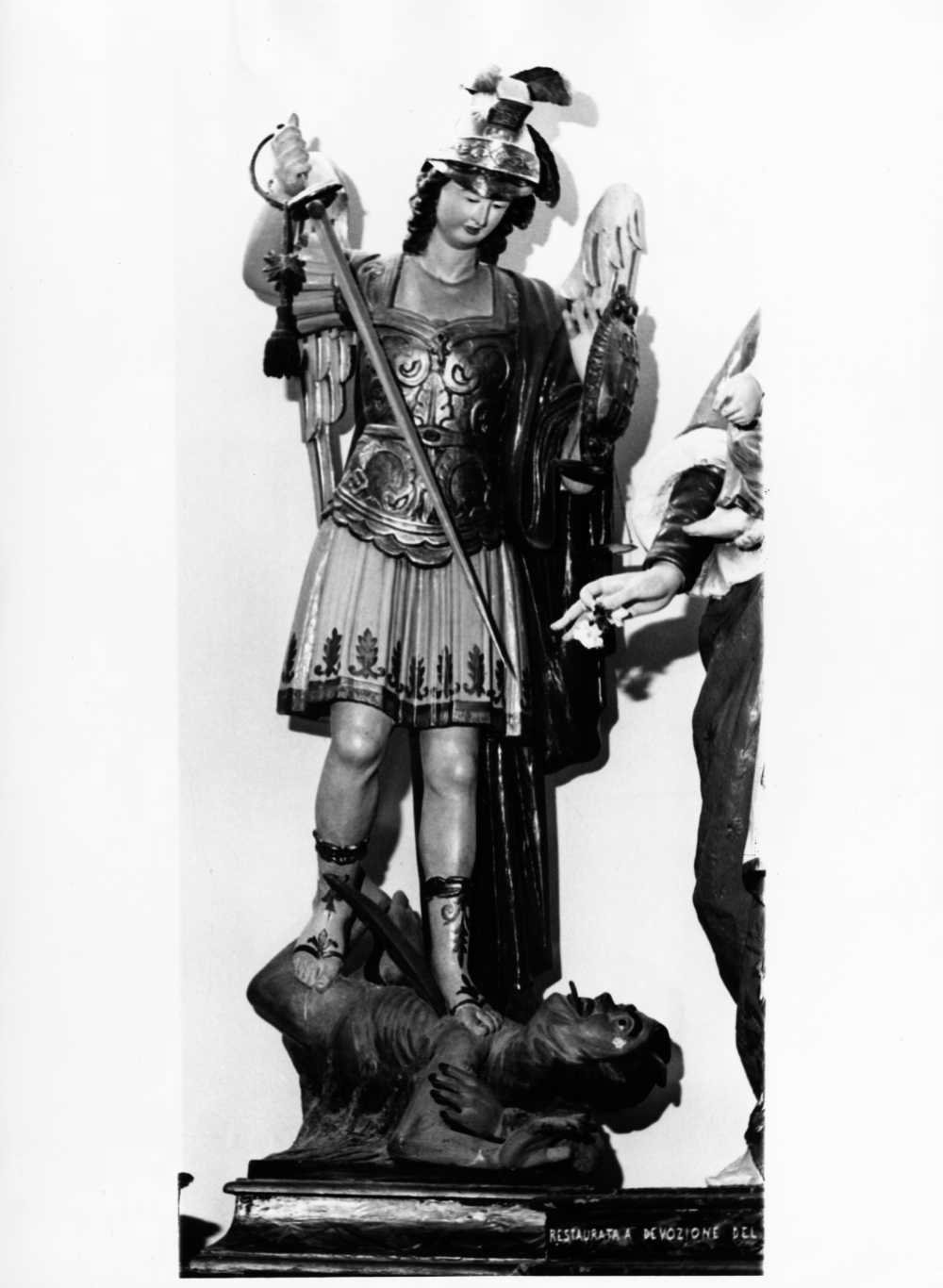 - NOTIZIE STORICO CRITICHE L'iconografia consueta in ambito napoletano, dopo i prototipi di Luca Giordano, dell'arcangelo guerriero col diavolo in sembianze umane è riproposta in questo esemplare, assai lontano dalle cadenze baroccheggianti settecentesche. La posizione gravitazionale sottolineata da una certa rigidezza dei movimenti fanno propendere per una datazione al secolo XIX, mancando tuttavia gli elementi per poter circoscrivere l'epoca di esecuzione. Lucifero è rappresentato in sembianze grottesche che trovano i precedenti nella produzione dei tipi del presepe napoletano