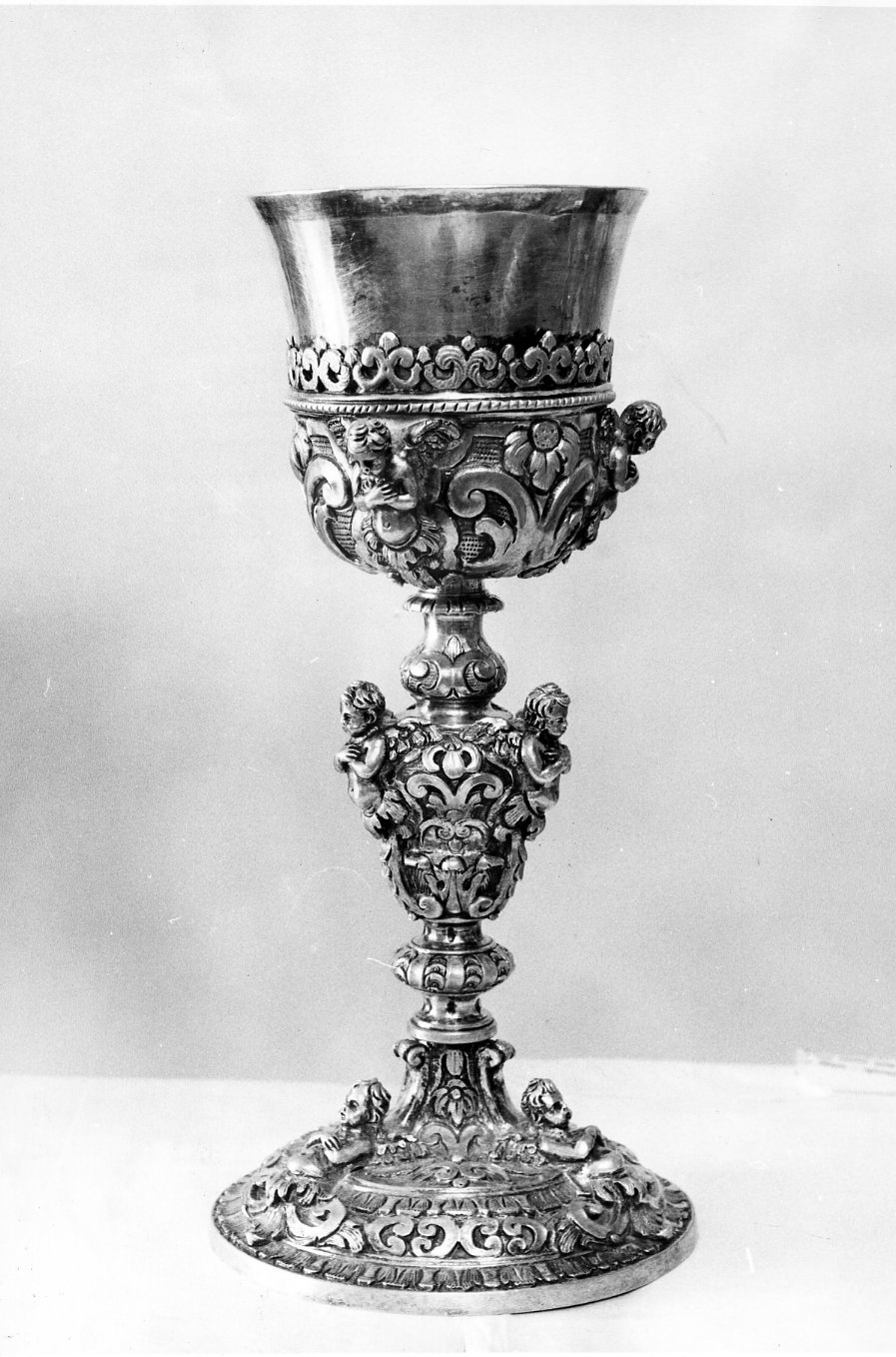 Sulla base circolare si imposta il fusto, interrotto dal nodo che sostiene la coppa; è lavorato a sbalzo con cornici, volute ed elementi floreali; sia sulla base che sul nodo e sulla parte esterna della coppa, si evidenziano tre protomi di putto con le mani congiunte sul petto