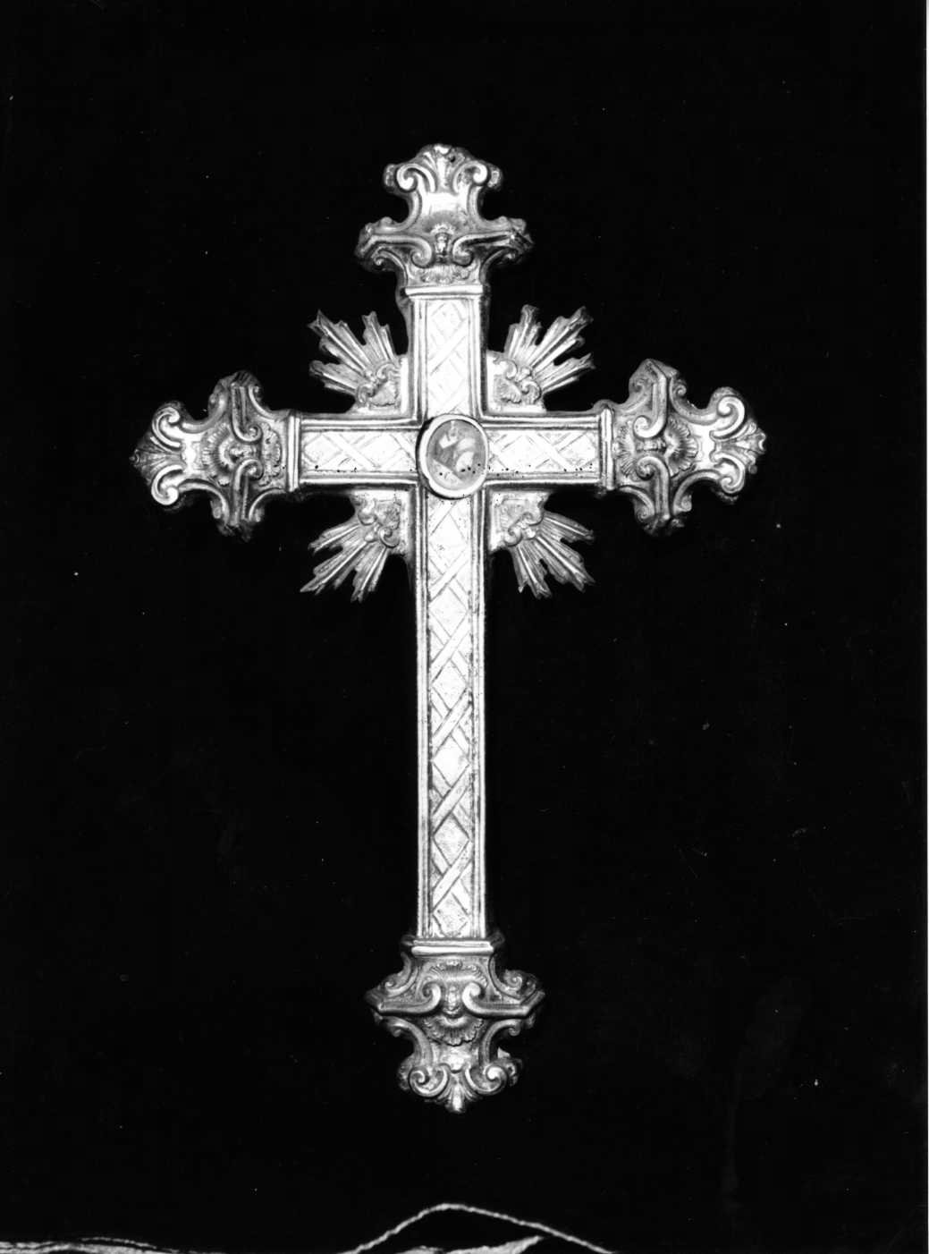 - NOTIZIE STORICO CRITICHE La piccola croce-reliquiario che, per i suoi caratteri stilistici e decorativi, si può datare al secolo XIX, ripete - seppure con estrema semplificazione - modelli di croci di diversa destinazione, caratteristici del secolo precedente