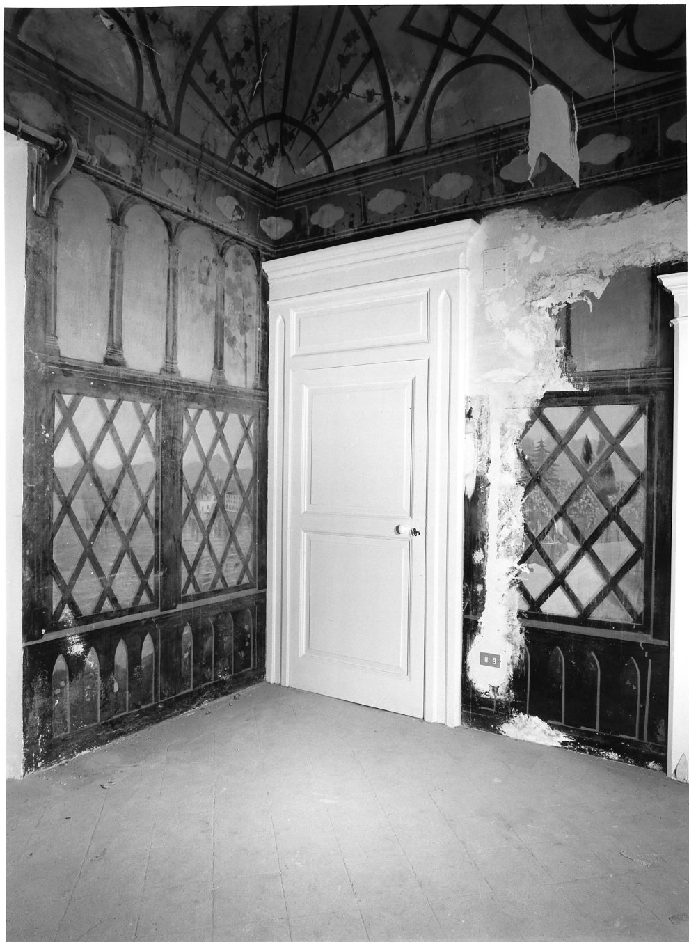 Pittura su muro raffigurante loggiato con archetti e colonnine e graticcio da cui appaiono vedute di paesaggio