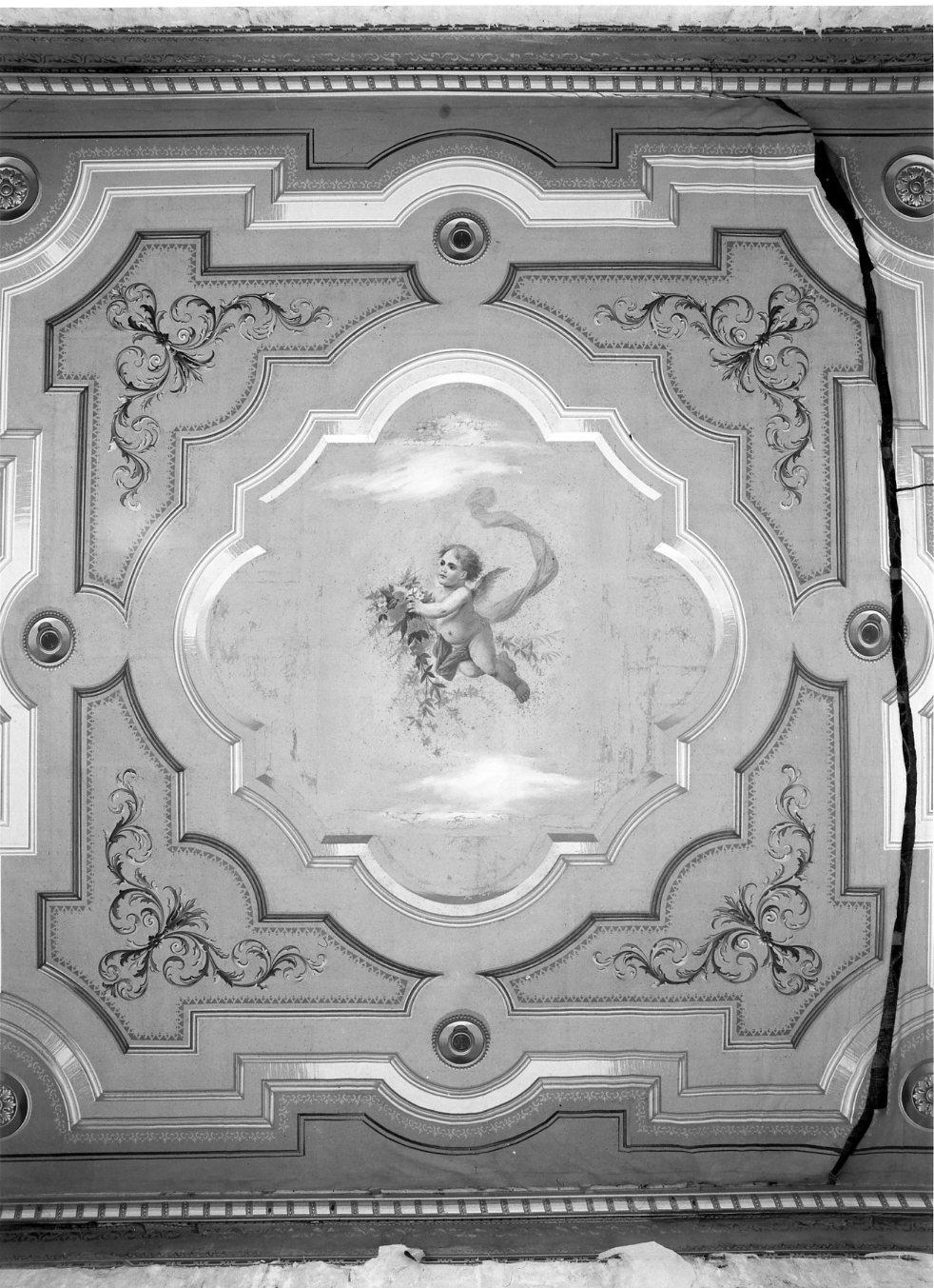 Dipinto a tempera su cartone applicato su tela, raffigura una cornice architettonica con al centro un angelo con fiori
