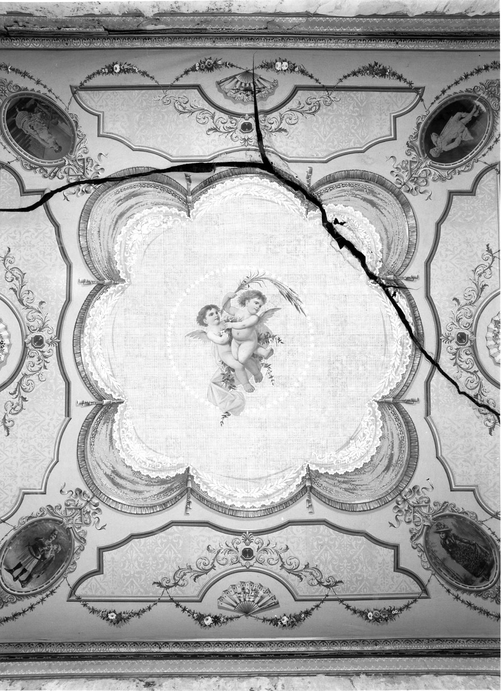 elementi architettonici, motivi vegetali, due angeli con fiori e spighe, medaglioni con figure