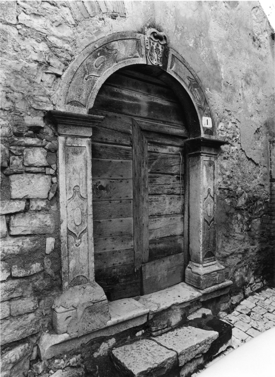 - NOTIZIE STORICO CRITICHE La semplicità delle linee architettoniche e la sobria decorazione inducono a datare il portale nell'ambito della produzione del XVIII secolo. L'ampia datazione si giustifica con l'impiego prolungato in ambito provinciale di tipi e soluzioni ornamentali riferibili, nel caso in oggetto, all'ultima fase del secolo