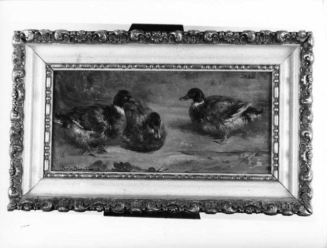 Dipinto ad olio su tavola, di formato rettangolare, raffigurante delle anatre