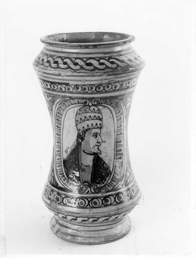 Alberello con corpo cilindrico, rastremato nel mezzo; sul un lato è una figura di pontefice a mezzobusto, entro una cornice baccellata, mentre sull’altro è una decorazione floreale. Spalla e piede ornati da un motivo a tralcio