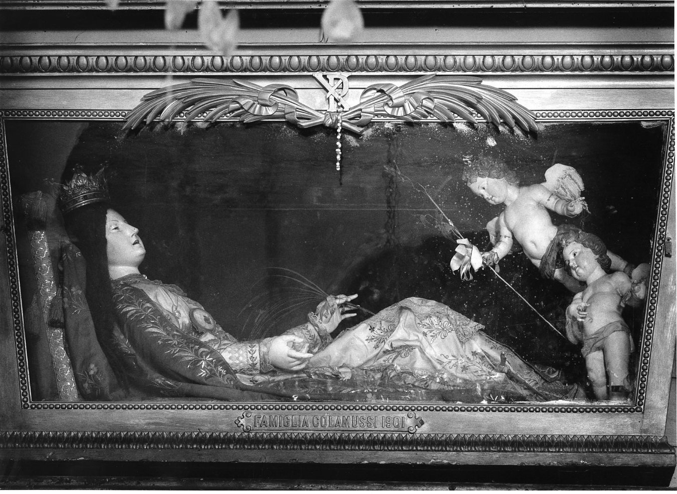 Personaggi: Santa Filomena. Figure: angeli. Attributi: (Santa Filomena) ancora; palma del martirio. Oggetti: corona
