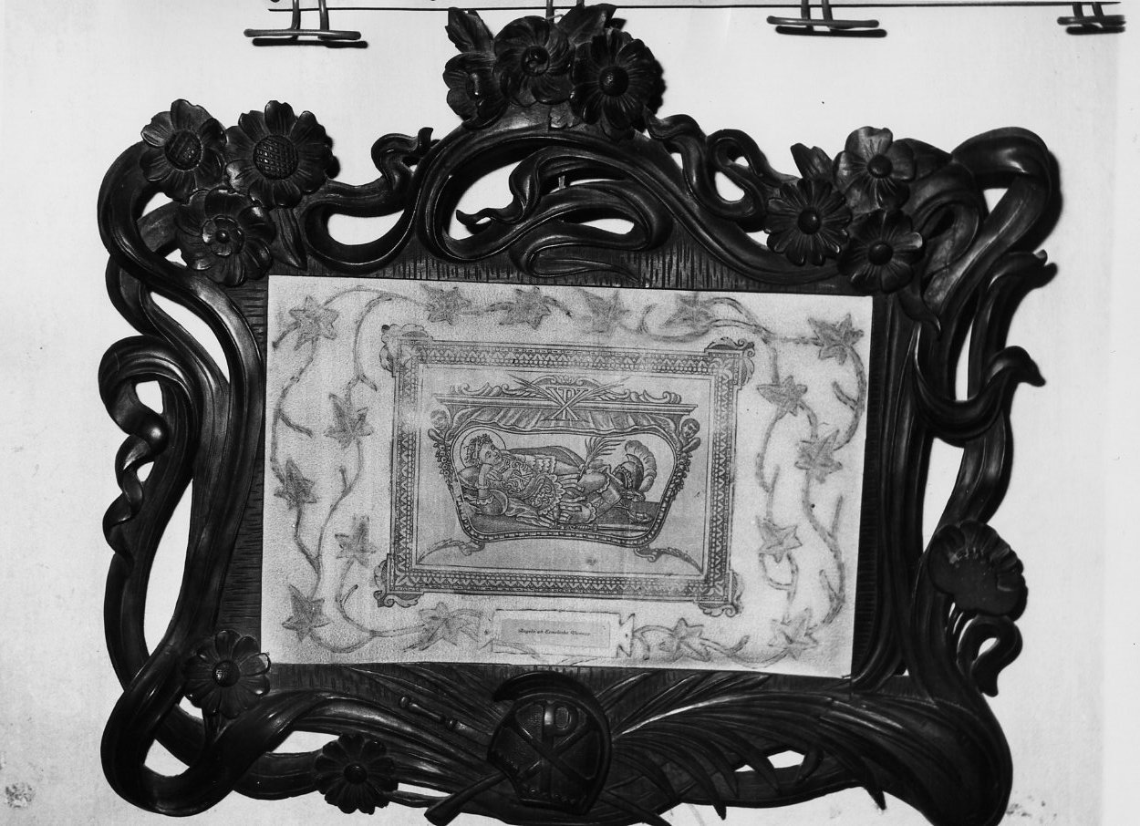 Cornice intagliata a motivi floreali contenente una stoffa rettangolare con sopra stampata l'immagine di un santo martire in abiti militari (S. Liberato o S. Giacomo?), deposto all'interno di una teca sulla quale è raffigurata il monogramma cristologico. Il Santo ha nella mano sinistra la palma del martirio. Tutto intorno alla raffigurazione tralci di edera ed in basso, al centro, un'iscrizione
