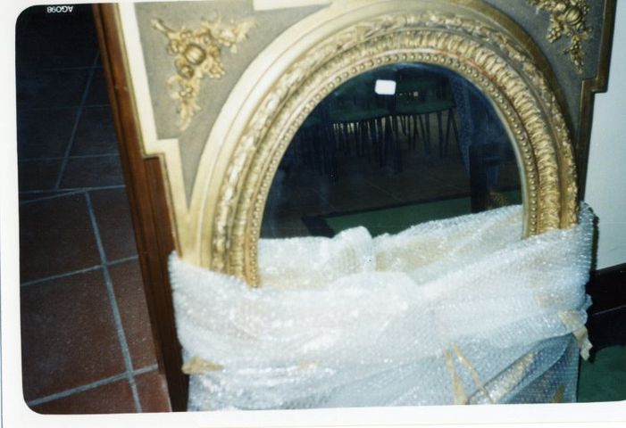 Specchiera con cornice in legno intagliato e dorato a finta mecca; presenta una decorazione eclettica ed originale, a metà tra stile Impero e Liberty