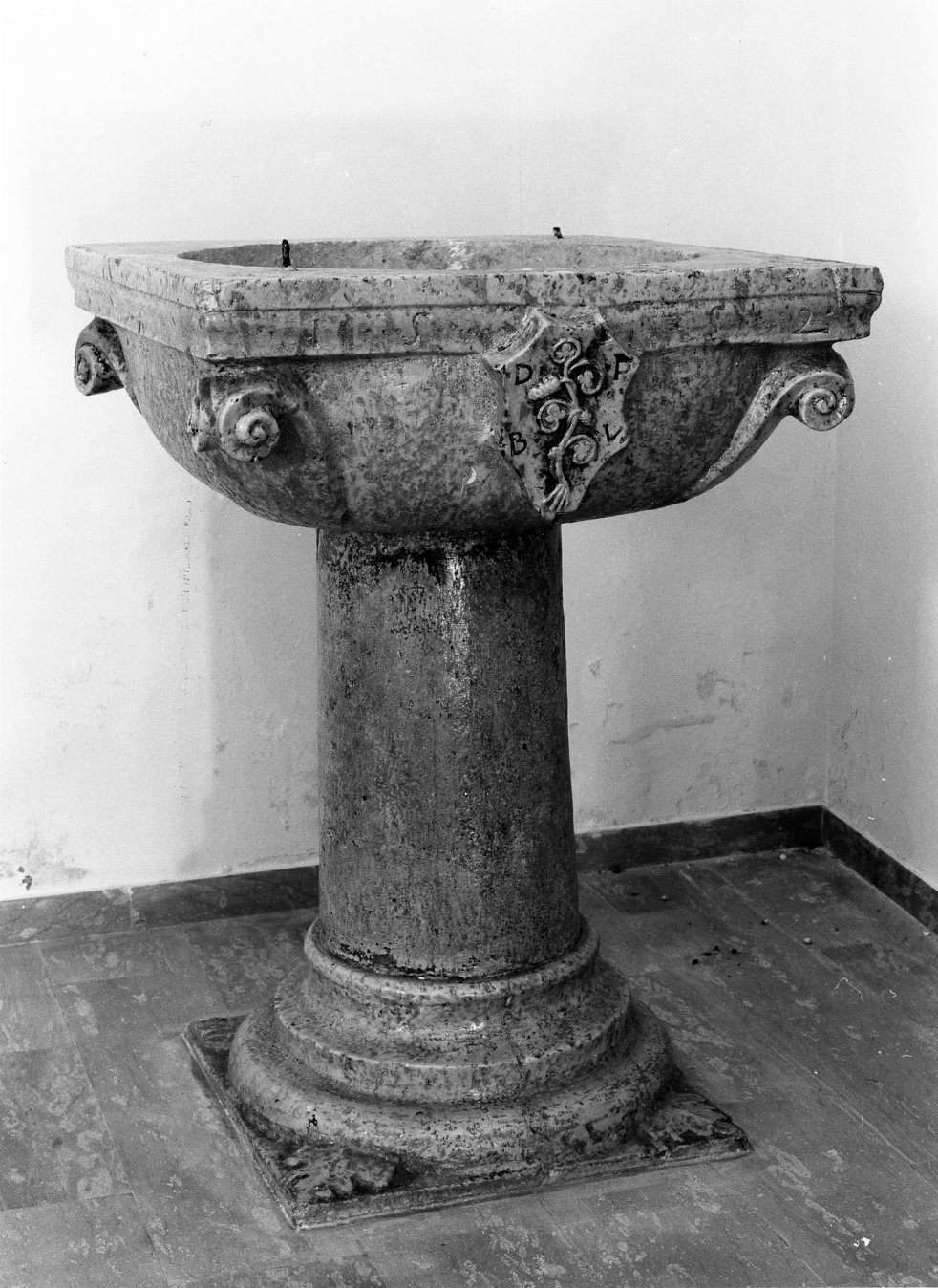 Vasca con bordo quadrato, forma tozzamente bombata con decorazioni a volute ioniche ai quattro lati; al centro stemma. Poggia su fusto di grande diametro, base sagomata