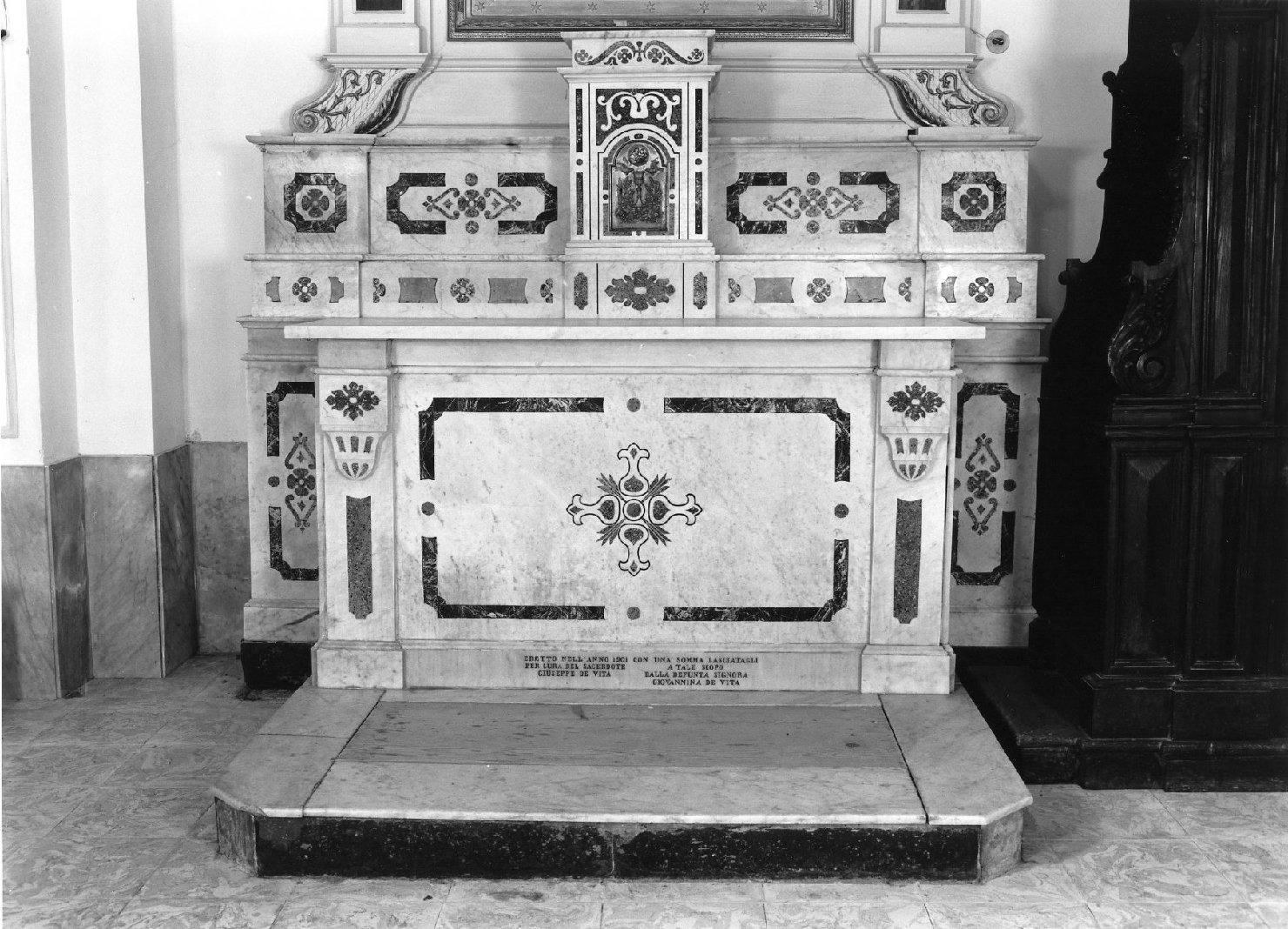 - ISCRIZIONI base (altare-navata sinistra) - ERETTO NELL'ANNO 1901/ PER CURA DEL SACERDOTE/ GIUSEPPE DE VITA/ CON UNA SOMMA LASCIATAGLI/ A TALE SCOPO/ DALLA DEFUNTA SIGNORA/ GIOVANNINA DE VITA - lettere capitali -
