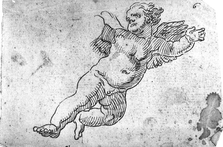 - NOTIZIE STORICO CRITICHE La raccolta, miscellanea di disegni, acquerelli, bozzetti, stampe etc. di vari artisti attivi nei secc. XVII e XVIII, fu recuperata nel 1983 presso le famiglie Iannadrea e Tirabassi, eredi dei Giuliani, Giacomo, padre, e Nicola, figlio, pittori e decoratori di Oratino (CB) operativi in ambito napoletano a cavallo dei secc. XIX-XX. Nicola, allievo di Morelli, la acquisì dagli eredi di Ciriaco Brunetti, pittore e decoratore oratinese attivo in tutto il Molise dalla prima metà del sec. XVIII agli inizi del XIX. Nel 1990 è stata acquistata dal MIBAC e custodita dalla locale Soprintendenza (specifiche dell’atto del 29/10/1990: 375 disegni su fogli singoli; un taccuino di 27 fogli, un taccuino di 21 fogli, un taccuino di 141 fogli, un volume rilegato contenente 54 fogli, 129 incisioni e 24 bozzetti ad olio su tela o cartone). Considerato che su un foglio sono stati realizzati più disegni-bozzetti-schizzi, il fondo è costituito da 700 disegni circa, di cui oltre la metà acquerellati, e da circa 330 stampe, italiane e tedesche, dei secc. XVI-XVIII. La collezione è composta da: disegni raccolti in n. 4 taccuini di Ciriaco Brunetti o Benedetto Brunetti, di varie dimensioni (n. 1 con figure di Santi e n. 3 con progetti per decorazioni); un album rilegato in pelle nel quale sono stati originariamente incollati circa 200 disegni di mani diverse (riportati a singoli foglio dopo il restauro). Vi sono inoltre: circa n. 200 studi per decorazioni in larga parte siglati o firmati da Ciriaco Brunetti; un gruppo di circa n. 70 accademie di nudo riconducibili alla bottega di Francesco Solimena; un gruppo di circa n. 30 disegni a soggetto sacro di Niccolò Falocco, pittore oratinese zio di Brunetti, allievo di Solimena, operativo a Napoli; n. 40 fogli di autori vari di ambito napoletano dei secc. XVI-XVIII (Balducci, Corenzio, Giaquinto etc.). L’importanza del fondo è data dalla sua unitarietà trattandosi di materiale di uso quotidiano, giunto quasi integro fino a noi, di un pittore gravitante in ambito provinciale, la cui produzione superstite è purtroppo oggi riconducibile solo ad una serie di dipinti, conservati in chiese molisane. Testimonia, inoltre, non solo la quotidiana, costante attività del Brunetti nell’ambito dei soggetti decorativi, ma anche l’operosa attività di una bottega oratinese in cui praticavano più esponenti dello stesso ambito familiare (Pietro, Beniamino, Benedetto e Stanislao Brunetti). Le opere, restaurate per oltre il 50% in tre fasi, dal 1992 al 1995 dai restauratori C. L. B. Borruso e P. Crisostomi, sono state custodite presso i depositi della Soprintendenza fino al 2015 anno di definitiva collocazione presso Castello Pandone di Venafro, dove, a rotazione, fanno parte dell’esposizione permanente del Museo. Il numero presente sulla facciata recto, in alto a destra, potrebbe indicare che il foglio faceva parte di un taccuino di bottega poi con il passare del tempo smembrato