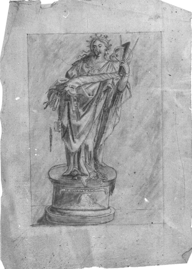 - NOTIZIE STORICO CRITICHE La raccolta, miscellanea di disegni, acquerelli, bozzetti, stampe etc. di vari artisti attivi nei secc. XVII e XVIII, fu recuperata nel 1983 presso le famiglie Iannadrea e Tirabassi, eredi dei Giuliani, Giacomo, padre, e Nicola, figlio, pittori e decoratori di Oratino (CB) operativi in ambito napoletano a cavallo dei secc. XIX-XX. Nicola, allievo di Morelli, la acquisì dagli eredi di Ciriaco Brunetti, pittore e decoratore oratinese attivo in tutto il Molise dalla prima metà del sec. XVIII agli inizi del XIX. Nel 1990 è stata acquistata dal MIBAC e custodita dalla locale Soprintendenza (specifiche dell’atto del 29/10/1990: 375 disegni su fogli singoli; un taccuino di 27 fogli, un taccuino di 21 fogli, un taccuino di 141 fogli, un volume rilegato contenente 54 fogli, 129 incisioni e 24 bozzetti ad olio su tela o cartone). Considerato che su un foglio sono stati realizzati più disegni-bozzetti-schizzi, il fondo è costituito da 700 disegni circa, di cui oltre la metà acquerellati, e da circa 330 stampe, italiane e tedesche, dei secc. XVI-XVIII. La collezione è composta da: disegni raccolti in n. 4 taccuini di Ciriaco Brunetti o Benedetto Brunetti, di varie dimensioni (n. 1 con figure di Santi e n. 3 con progetti per decorazioni); un album rilegato in pelle nel quale sono stati originariamente incollati circa 200 disegni di mani diverse (riportati a singoli foglio dopo il restauro). Vi sono inoltre: circa n. 200 studi per decorazioni in larga parte siglati o firmati da Ciriaco Brunetti; un gruppo di circa n. 70 accademie di nudo riconducibili alla bottega di Francesco Solimena; un gruppo di circa n. 30 disegni a soggetto sacro di Niccolò Falocco, pittore oratinese zio di Brunetti, allievo di Solimena, operativo a Napoli; n. 40 fogli di autori vari di ambito napoletano dei secc. XVI-XVIII (Balducci, Corenzio, Giaquinto etc.). L’importanza del fondo è data dalla sua unitarietà trattandosi di materiale di uso quotidiano, giunto quasi integro fino a noi, di un pittore gravitante in ambito provinciale, la cui produzione superstite è purtroppo oggi riconducibile solo ad una serie di dipinti, conservati in chiese molisane. Testimonia, inoltre, non solo la quotidiana, costante attività del Brunetti nell’ambito dei soggetti decorativi, ma anche l’operosa attività di una bottega oratinese in cui praticavano più esponenti dello stesso ambito familiare (Pietro, Beniamino, Benedetto e Stanislao Brunetti). Le opere, restaurate per oltre il 50% in tre fasi, dal 1992 al 1995 dai restauratori C. L. B. Borruso e P. Crisostomi, sono state custodite presso i depositi della Soprintendenza fino al 2015 anno di definitiva collocazione presso Castello Pandone di Venafro, dove, a rotazione, fanno parte dell’esposizione permanente del Museo. Il foglio è disegnato solo su una faccia; la figura femminile sul piedistallo potrebbe essere una delle quattro virtù cardinali, la Fortezza: ciò si può desumere dagli oggetti rappresentati nella raffigurazione