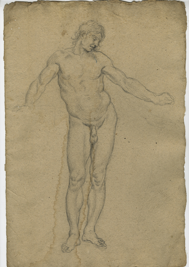 - NOTIZIE STORICO CRITICHE La raccolta, miscellanea di disegni, acquerelli, bozzetti, stampe etc. di vari artisti attivi nei secc.XVII e XVIII , fu recuperata nel 1983 presso le famiglie Iannadrea e Tirabassi, eredi dei Giuliani, Giacomo, padre, e Nicola, figlio, pittori e decoratori di Oratino (CB) operativi in ambito napoletano a cavallo dei secc. XIX-XX. Nicola, allievo di Morelli, la acquisì dagli eredi di Ciriaco Brunetti, pittore e decoratore oratinese attivo in tutto il Molise dalla prima metà del sec. XVIII agli inizi del XIX. Nel 1990 è stata acquistata dal MIBAC e custodita dalla locale Soprintendenza (specifiche dell’atto del 29/10/1990: 375 disegni su fogli singoli; un taccuino di 27 fogli, un taccuino di 21 fogli, un taccuino di 141 fogli, un volume rilegato contenente 54 fogli, 129 incisioni e 24 bozzetti ad olio su tela o cartone). Considerato che su un foglio sono stati realizzati più disegni-bozzetti-schizzi, il fondo è costituito da 700 disegni circa, di cui oltre la metà acquerellati, e da circa 330 stampe, italiane e tedesche, dei secc. XVI-XVIII. La collezione è composta da: disegni raccolti in n. 4 taccuini di Ciriaco Brunetti o Beniamino Brunetti, di varie dimensioni (n. 1 con figure di Santi e n. 3 con progetti per decorazioni); un album rilegato in pelle nel quale sono stati originariamente incollati circa 200 disegni di mani diverse (riportati a singoli foglio dopo il restauro). Vi sono inoltre: circa n. 200 studi per decorazioni in larga parte siglati o firmati da Ciriaco Brunetti; un gruppo di circa n. 70 accademie di nudo riconducibili alla bottega di Francesco Solimena; un gruppo di circa n. 30 disegni a soggetto sacro di Niccolò Falocco, pittore oratinese zio di Brunetti, allievo di Solimena, operativo a Napoli; n. 40 fogli di autori vari di ambito napoletano dei secc. XVI-XVIII (Balducci, Corenzio, Giaquinto etc.). L’importanza del fondo è data dalla sua unitarietà trattandosi di materiale di uso quotidiano, giunto quasi integro fino a noi, di un pittore gravitante in ambito provinciale, la cui produzione superstite è purtroppo oggi riconducibile solo ad una serie di dipinti, conservati in chiese molisane. Testimonia, inoltre, non solo la quotidiana, costante attività del Brunetti nell’ambito dei soggetti decorativi, ma anche l’operosa attività di una bottega oratinese in cui praticavano più esponenti dello stesso ambito familiare (Pietro, Beniamino, Benedetto e Stanislao Brunetti). Le opere, restaurate per oltre il 50% in tre fasi, dal 1992 al 1995 dai restauratori C. L. B. Borruso e P. Crisostomi, sono state custodite presso i depositi della Soprintendenza fino al 2015 anno di definitiva collocazione presso Castello Pandone di Venafro, dove, a rotazione, fanno parte dell’esposizione permanente del Museo.Il gruppo di nudi d’accademia appartenenti alla Collezione Giuliani ne rappresenta uno degli elementi più interessanti. Poiché nessuno dei disegni presenta le caratteristiche di precisione quasi incisoria del ductus di Nicolò Falocco, Riccardo Lattuada nel Catalogo della mostra del 1993 ne attribuisce la produzione al solo Ciriaco Brunetti. Anche nei nudi, così come nel resto della sua produzione grafica, si riconosce il totale allineamento di Ciriaco alla linea espressa da Francesco Solimena, del quale restano, come studi esemplari, la figura di Pastore e la Figura orante della Società Napoletana di Storia Patria. Il dinamismo espresso però dalla grafica accademica del Solimena si spegne nel Brunetti in quell’atteggiamento classicheggiante e di sapore ormai ottocentesco che prevale nell’ambiente napoletano dopo la fondazione della Reale Accademia del Disegno (1752) e in seguito alle posizioni antisolimeniane espresse da Luigi Vanvitelli. Il corpus dei disegni era anticipato da un foglio sul cui verso è riportata la dicitura "DESEGNI DI UOMINI NUDI" e che fungeva da raccoglitore-indicatore di tutti i disegni di nudo (scheda n. 1400080662). Entrambe le figure, presenti una sul recto e una sul verso, mostrano, oltre alla qualità del disegno e della resa anatomica, un richiamo allo stile classicheggiante che prevale in questa fase della produzione brunettiana