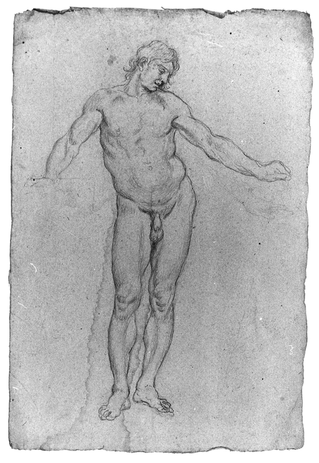 Recto: figura di uomo nudo in piedi con la mano destra poggiata su un bastone ed il braccio sinistro alzato. Verso: figura di uomo nudo in piedi con la testa volta a sinistra e le braccia discoste dal corpo e in parte alzate