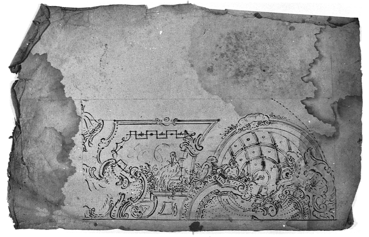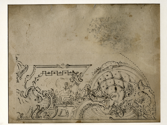 Il foglio è disegnato su entrambi i lati. Recto: una figura femminile con cornucopia e forse spighe nella mano sollevata è quasi sovrapposta a quella di un vecchio barbuto alla sua destra, nudo e intirizzito. Verso: fascia decorativa curvata a destra con volute architettoniche, una cicogna e una coppia di pappagalli