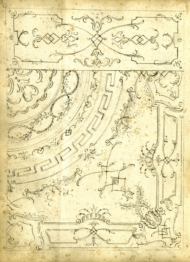 - NOTIZIE STORICO CRITICHE La raccolta, miscellanea di disegni, acquerelli, bozzetti, stampe etc. di vari artisti attivi nei secc. XVII e XVIII, fu recuperata nel 1983 presso le famiglie Iannadrea e Tirabassi, eredi dei Giuliani, Giacomo, padre, e Nicola, figlio, pittori e decoratori di Oratino (CB) operativi in ambito napoletano a cavallo dei secc. XIX-XX. Nicola, allievo di Morelli, la acquisì dagli eredi di Ciriaco Brunetti, pittore e decoratore oratinese attivo in tutto il Molise dalla prima metà del sec. XVIII agli inizi del XIX. Nel 1990 è stata acquistata dal MIBAC e custodita dalla locale Soprintendenza (specifiche dell’atto del 29/10/1990: 375 disegni su fogli singoli; un taccuino di 27 fogli, un taccuino di 21 fogli, un taccuino di 141 fogli, un volume rilegato contenente 54 fogli, 129 incisioni e 24 bozzetti ad olio su tela o cartone). Considerato che su un foglio sono stati realizzati più disegni-bozzetti-schizzi, il fondo è costituito da 700 disegni circa, di cui oltre la metà acquerellati, e da circa 330 stampe, italiane e tedesche, dei secc. XVI-XVIII. La collezione è composta da: disegni raccolti in n. 4 taccuini di Ciriaco Brunetti o Benedetto Brunetti, di varie dimensioni (n. 1 con figure di Santi e n. 3 con progetti per decorazioni); un album rilegato in pelle nel quale sono stati originariamente incollati circa 200 disegni di mani diverse (riportati a singoli foglio dopo il restauro). Vi sono inoltre: circa n. 200 studi per decorazioni in larga parte siglati o firmati da Ciriaco Brunetti; un gruppo di circa n. 70 accademie di nudo riconducibili alla bottega di Francesco Solimena; un gruppo di circa n. 30 disegni a soggetto sacro di Niccolò Falocco, pittore oratinese zio di Brunetti, allievo di Solimena, operativo a Napoli; n. 40 fogli di autori vari di ambito napoletano dei secc. XVI-XVIII (Balducci, Corenzio, Giaquinto etc.). L’importanza del fondo è data dalla sua unitarietà trattandosi di materiale di uso quotidiano, giunto quasi integro fino a noi, di un pittore gravitante in ambito provinciale, la cui produzione superstite è purtroppo oggi riconducibile solo ad una serie di dipinti, conservati in chiese molisane. Testimonia, inoltre, non solo la quotidiana, costante attività del Brunetti nell’ambito dei soggetti decorativi, ma anche l’operosa attività di una bottega oratinese in cui praticavano più esponenti dello stesso ambito familiare (Pietro, Beniamino, Benedetto e Stanislao Brunetti). Le opere, restaurate per oltre il 50% in tre fasi, dal 1992 al 1995 dai restauratori C. L. B. Borruso e P. Crisostomi, sono state custodite presso i depositi della Soprintendenza fino al 2015 anno di definitiva collocazione presso Castello Pandone di Venafro, dove, a rotazione, fanno parte dell’esposizione permanente del Museo. I tre Taccuini di progetti per decorazioni conservati nella Collezione costituiscono un vero e proprio campionario di modelli decorativi e figurativi da proporre ai committenti e desunti dallo studio di stampe e modelli francesi e tedeschi a disposizione degli artisti tra Seicento e Settecento. Il presente Taccuino, inventariato con il numero 34432 all’interno della collezione, è composto da 54 fogli rilegati con laccio di cuoio, a cui si aggiunge un foglio sciolto ritenuto pertinente al bene. I fogli sono disegnati su entrambi i lati e mostrano diverse possibilità di soluzioni decorative per interni di carattere profano. Molti sono i progetti per soffitti con finte architetture prospettiche e fregi di raccordo fiorati. Ma altrettante sono le proposte decorative per pareti, definite “muraglie” sul disegno, che fanno riferimento ad ambiti formali e decorativi diversi: da quelle squisitamente rocailles, con cornici mistilinee in cui si inseriscono elementi paesaggistici, a quelle di gusto già neoclassico con elementi decorativi lineari e geometrici. Molti sono i fogli raffiguranti soluzioni per sovrapporte nelle quali cornici a rocaille inquadrano scene di genere (animali e scene di vita campestre) o serie di allegorie riguardanti le quattro stagioni o gli elementi della natura. Nel complesso si tratta di un oggetto di grandissimo rilievo storico e artistico per la sua rarità, essendo uno degli unici esemplari del genere conservato in ambito meridionale. L’esecuzione del Taccuino, considerata l’omogeneità e la qualità stilista dei disegni, è comunemente attribuita da Giovanni Borrelli, nelle schede, e da Gian Giotto Borrelli, nel catalogo della mostra, a Ciriaco Brunetti e collocato cronologicamente alla metà degli anni Sessanta del XVIII secolo. Il disegno sul recto del foglio appartiene alla serie delle “Allegorie dei Quattro Elementi” presenti nel Taccuino nei foglio con scheda di catalogo 1400081079, 1400081080, 1400081081, 1400081082 con raffigurazione dell’Acqua, Aria, Fuoco e Terra