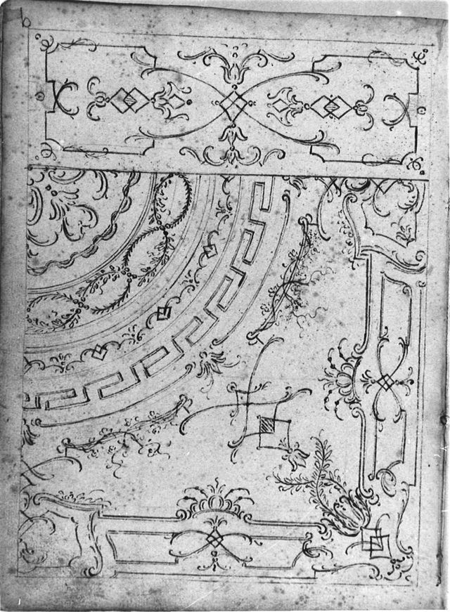 Il foglio di taccuino è disegnato su entrambi i lati. Recto: rarrigurazione dell'acqua incorniciata in una cornice rocalles, con un putto seduto su uno scoglio tra due tritoni. Verso: delimitto da un quadrato, inconriciatura mistilinea su due lati nella parte inferiore; nella parte interna angolare con fascia di motivi a greca e fascia con ghirlanda. In alto un rettangolo con decorazione geometrzzante