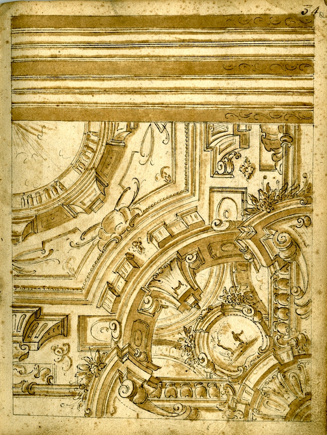 - NOTIZIE STORICO CRITICHE La raccolta, miscellanea di disegni, acquerelli, bozzetti, stampe etc. di vari artisti attivi nei secc. XVII e XVIII, fu recuperata nel 1983 presso le famiglie Iannadrea e Tirabassi, eredi dei Giuliani, Giacomo, padre, e Nicola, figlio, pittori e decoratori di Oratino (CB) operativi in ambito napoletano a cavallo dei secc. XIX-XX. Nicola, allievo di Morelli, la acquisì dagli eredi di Ciriaco Brunetti, pittore e decoratore oratinese attivo in tutto il Molise dalla prima metà del sec. XVIII agli inizi del XIX. Nel 1990 è stata acquistata dal MIBAC e custodita dalla locale Soprintendenza (specifiche dell’atto del 29/10/1990: 375 disegni su fogli singoli; un taccuino di 27 fogli, un taccuino di 21 fogli, un taccuino di 141 fogli, un volume rilegato contenente 54 fogli, 129 incisioni e 24 bozzetti ad olio su tela o cartone). Considerato che su un foglio sono stati realizzati più disegni-bozzetti-schizzi, il fondo è costituito da 700 disegni circa, di cui oltre la metà acquerellati, e da circa 330 stampe, italiane e tedesche, dei secc. XVI-XVIII. La collezione è composta da: disegni raccolti in n. 4 taccuini di Ciriaco Brunetti o Benedetto Brunetti, di varie dimensioni (n. 1 con figure di Santi e n. 3 con progetti per decorazioni); un album rilegato in pelle nel quale sono stati originariamente incollati circa 200 disegni di mani diverse (riportati a singoli foglio dopo il restauro). Vi sono inoltre: circa n. 200 studi per decorazioni in larga parte siglati o firmati da Ciriaco Brunetti; un gruppo di circa n. 70 accademie di nudo riconducibili alla bottega di Francesco Solimena; un gruppo di circa n. 30 disegni a soggetto sacro di Niccolò Falocco, pittore oratinese zio di Brunetti, allievo di Solimena, operativo a Napoli; n. 40 fogli di autori vari di ambito napoletano dei secc. XVI-XVIII (Balducci, Corenzio, Giaquinto etc.). L’importanza del fondo è data dalla sua unitarietà trattandosi di materiale di uso quotidiano, giunto quasi integro fino a noi, di un pittore gravitante in ambito provinciale, la cui produzione superstite è purtroppo oggi riconducibile solo ad una serie di dipinti, conservati in chiese molisane. Testimonia, inoltre, non solo la quotidiana, costante attività del Brunetti nell’ambito dei soggetti decorativi, ma anche l’operosa attività di una bottega oratinese in cui praticavano più esponenti dello stesso ambito familiare (Pietro, Beniamino, Benedetto e Stanislao Brunetti). Le opere, restaurate per oltre il 50% in tre fasi, dal 1992 al 1995 dai restauratori C. L. B. Borruso e P. Crisostomi, sono state custodite presso i depositi della Soprintendenza fino al 2015 anno di definitiva collocazione presso Castello Pandone di Venafro, dove, a rotazione, fanno parte dell’esposizione permanente del Museo. I tre Taccuini di progetti per decorazioni conservati nella Collezione costituiscono un vero e proprio campionario di modelli decorativi e figurativi da proporre ai committenti e desunti dallo studio di stampe e modelli francesi e tedeschi a disposizione degli artisti tra Seicento e Settecento. Il presente Taccuino, inventariato con il numero 34432 all’interno della collezione, è composto da 54 fogli rilegati con laccio di cuoio, a cui si aggiunge un foglio sciolto ritenuto pertinente al bene. I fogli sono disegnati su entrambi i lati e mostrano diverse possibilità di soluzioni decorative per interni di carattere profano. Molti sono i progetti per soffitti con finte architetture prospettiche e fregi di raccordo fiorati. Ma altrettante sono le proposte decorative per pareti, definite “muraglie” sul disegno, che fanno riferimento ad ambiti formali e decorativi diversi: da quelle squisitamente rocailles, con cornici mistilinee in cui si inseriscono elementi paesaggistici, a quelle di gusto già neoclassico con elementi decorativi lineari e geometrici. Molti sono i fogli raffiguranti soluzioni per sovrapporte nelle quali cornici a rocaille inquadrano scene di genere (animali e scene di vita campestre) o serie di allegorie riguardanti le quattro stagioni o gli elementi della natura. Nel complesso si tratta di un oggetto di grandissimo rilievo storico e artistico per la sua rarità, essendo uno degli unici esemplari del genere conservato in ambito meridionale. L’esecuzione del Taccuino, considerata l’omogeneità e la qualità stilista dei disegni, è comunemente attribuita da Giovanni Borrelli, nelle schede, e da Gian Giotto Borrelli, nel catalogo della mostra, a Ciriaco Brunetti e collocato cronologicamente alla metà degli anni Sessanta del XVIII secolo