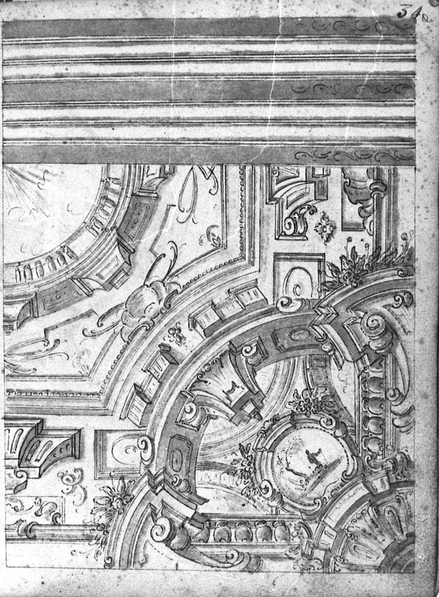 Il foglio di taccuino è disegnato su entrambi i lati. Recto: disegno di angolare di volta in campo quadrato con arco ornato da mensole e lacunari e pennacchio sormontato da paesaggio incorniciato da volute. In alto fascia decorativa a bande orizzontali. Verso:disegno di angolare di volta in campo quadrato con due archi oranti da lacunari che inquadrano un pennacchio sormontato da cornice vuota. In alto fasca decorativa con elemento rocaille
