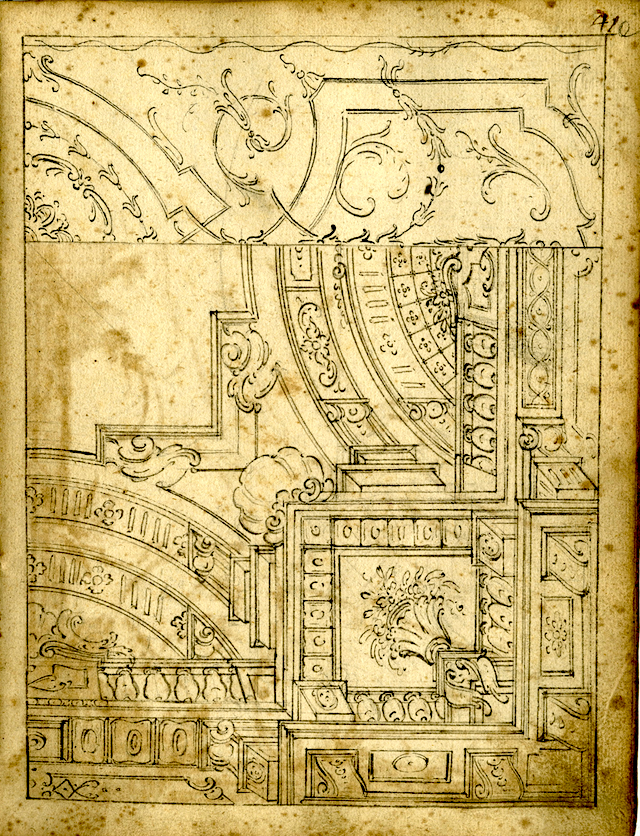 Il foglio di taccuino è disegnato su entrambi i lati. Recto: disegno di angolare di volta in campo quadrato con cornicione mistilineo ornato da lacunari e sostenuto da mensole e volute su cui poggiano due archi. In alto fascia decorativa con specchiturea arricchita da girali vegetali. Verso:disegno di angolare di volta in campo quadrato con cornicione oranto da cartocci e volute, presenta un paesaggio incorniciato da serti e al centro una serie di facse concentriche che alternano motivi fogliacei a motivi geometrici. In alto fascia decorativa orizzontale con sezione di specchitura mistilinea ornata da racemi