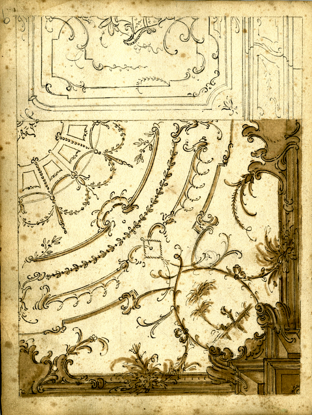 - NOTIZIE STORICO CRITICHE La raccolta, miscellanea di disegni, acquerelli, bozzetti, stampe etc. di vari artisti attivi nei secc. XVII e XVIII, fu recuperata nel 1983 presso le famiglie Iannadrea e Tirabassi, eredi dei Giuliani, Giacomo, padre, e Nicola, figlio, pittori e decoratori di Oratino (CB) operativi in ambito napoletano a cavallo dei secc. XIX-XX. Nicola, allievo di Morelli, la acquisì dagli eredi di Ciriaco Brunetti, pittore e decoratore oratinese attivo in tutto il Molise dalla prima metà del sec. XVIII agli inizi del XIX. Nel 1990 è stata acquistata dal MIBAC e custodita dalla locale Soprintendenza (specifiche dell’atto del 29/10/1990: 375 disegni su fogli singoli; un taccuino di 27 fogli, un taccuino di 21 fogli, un taccuino di 141 fogli, un volume rilegato contenente 54 fogli, 129 incisioni e 24 bozzetti ad olio su tela o cartone). Considerato che su un foglio sono stati realizzati più disegni-bozzetti-schizzi, il fondo è costituito da 700 disegni circa, di cui oltre la metà acquerellati, e da circa 330 stampe, italiane e tedesche, dei secc. XVI-XVIII. La collezione è composta da: disegni raccolti in n. 4 taccuini di Ciriaco Brunetti o Benedetto Brunetti, di varie dimensioni (n. 1 con figure di Santi e n. 3 con progetti per decorazioni); un album rilegato in pelle nel quale sono stati originariamente incollati circa 200 disegni di mani diverse (riportati a singoli foglio dopo il restauro). Vi sono inoltre: circa n. 200 studi per decorazioni in larga parte siglati o firmati da Ciriaco Brunetti; un gruppo di circa n. 70 accademie di nudo riconducibili alla bottega di Francesco Solimena; un gruppo di circa n. 30 disegni a soggetto sacro di Niccolò Falocco, pittore oratinese zio di Brunetti, allievo di Solimena, operativo a Napoli; n. 40 fogli di autori vari di ambito napoletano dei secc. XVI-XVIII (Balducci, Corenzio, Giaquinto etc.). L’importanza del fondo è data dalla sua unitarietà trattandosi di materiale di uso quotidiano, giunto quasi integro fino a noi, di un pittore gravitante in ambito provinciale, la cui produzione superstite è purtroppo oggi riconducibile solo ad una serie di dipinti, conservati in chiese molisane. Testimonia, inoltre, non solo la quotidiana, costante attività del Brunetti nell’ambito dei soggetti decorativi, ma anche l’operosa attività di una bottega oratinese in cui praticavano più esponenti dello stesso ambito familiare (Pietro, Beniamino, Benedetto e Stanislao Brunetti). Le opere, restaurate per oltre il 50% in tre fasi, dal 1992 al 1995 dai restauratori C. L. B. Borruso e P. Crisostomi, sono state custodite presso i depositi della Soprintendenza fino al 2015 anno di definitiva collocazione presso Castello Pandone di Venafro, dove, a rotazione, fanno parte dell’esposizione permanente del Museo. I tre Taccuini di progetti per decorazioni conservati nella Collezione costituiscono un vero e proprio campionario di modelli decorativi e figurativi da proporre ai committenti e desunti dallo studio di stampe e modelli francesi e tedeschi a disposizione degli artisti tra Seicento e Settecento. Il presente Taccuino, inventariato con il numero 34432 all’interno della collezione, è composto da 54 fogli rilegati con laccio di cuoio, a cui si aggiunge un foglio sciolto ritenuto pertinente al bene. I fogli sono disegnati su entrambi i lati e mostrano diverse possibilità di soluzioni decorative per interni di carattere profano. Molti sono i progetti per soffitti con finte architetture prospettiche e fregi di raccordo fiorati. Ma altrettante sono le proposte decorative per pareti, definite “muraglie” sul disegno, che fanno riferimento ad ambiti formali e decorativi diversi: da quelle squisitamente rocailles, con cornici mistilinee in cui si inseriscono elementi paesaggistici, a quelle di gusto già neoclassico con elementi decorativi lineari e geometrici. Molti sono i fogli raffiguranti soluzioni per sovrapporte nelle quali cornici a rocaille inquadrano scene di genere (animali e scene di vita campestre) o serie di allegorie riguardanti le quattro stagioni o gli elementi della natura. Nel complesso si tratta di un oggetto di grandissimo rilievo storico e artistico per la sua rarità, essendo uno degli unici esemplari del genere conservato in ambito meridionale. L’esecuzione del Taccuino, considerata l’omogeneità e la qualità stilista dei disegni, è comunemente attribuita da Giovanni Borrelli, nelle schede, e da Gian Giotto Borrelli, nel catalogo della mostra, a Ciriaco Brunetti e collocato cronologicamente alla metà degli anni Sessanta del XVIII secolo