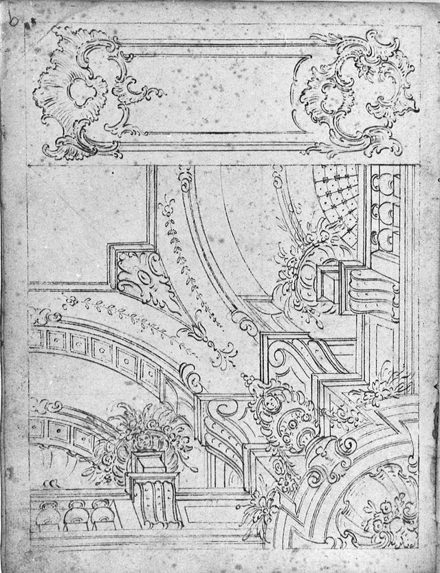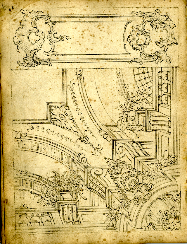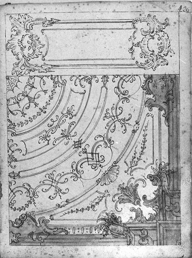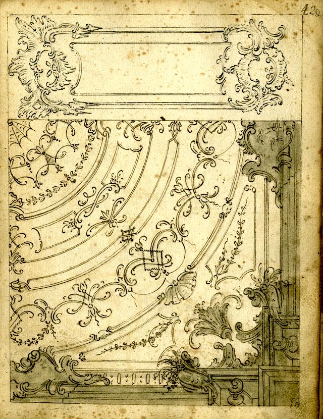 Il foglio di taccuino è disegnato su entrambi i lati. Recto: disegno di angolare di volta in campo quadrato con cornicione mistilineo ornato da cartocci e sostenuto da mensole e volute; verso il centro una serie di fasce concentriche che alternano motivi fogliacei a mtivi geometrici. In alto fascia decorativa orizzontale con specchiatura ornata da motivi rocaille. Verso: disegno di angolare di volta in campo quadratocon cornicione mistilineo, balaustrata e mensole aggettanti sormontate da vasi con fiori su cui si impostano archi. In alto fascia orizzontale con specchiatura inquadrata da motivi rocaille