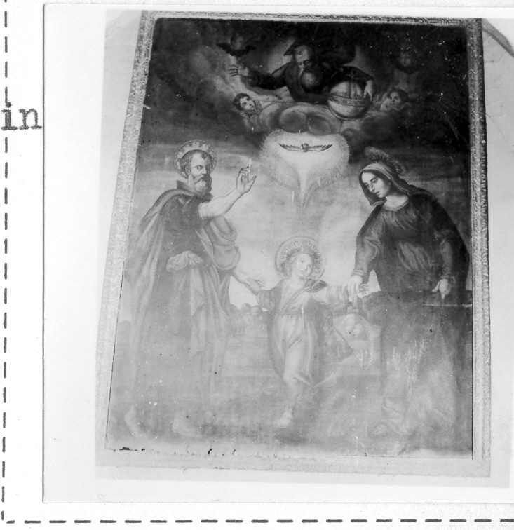 La Sacra Famiglia è ambientata in un semplice paesaggio San Giuseppe sulla sinistra e la Madonna a destra tengono per mano Gesù, vestito da una lunga tunicia. In alto è il Padre eterno e sotto di lui lo Spirito Santo