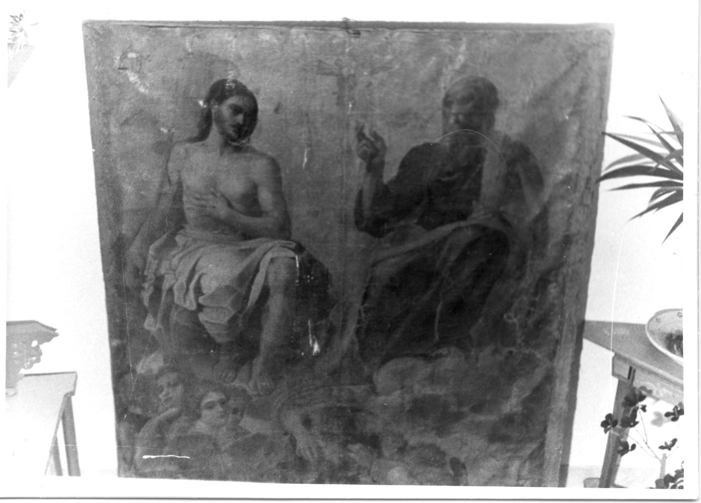 A destra seduto è Dio Padre, a sinistra Cristo risorto e in alto la colomba dello Spirito Santo; in basso angeli