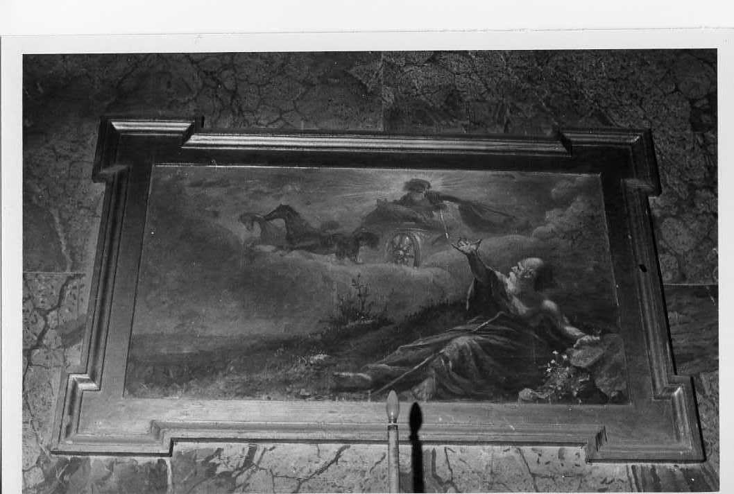 Mosè seduto su un declivio erboso con accanto le tavole della legge, egli è illuminato dalla visione di Dio che appare in alto su di un cocchio trainato da cavalli