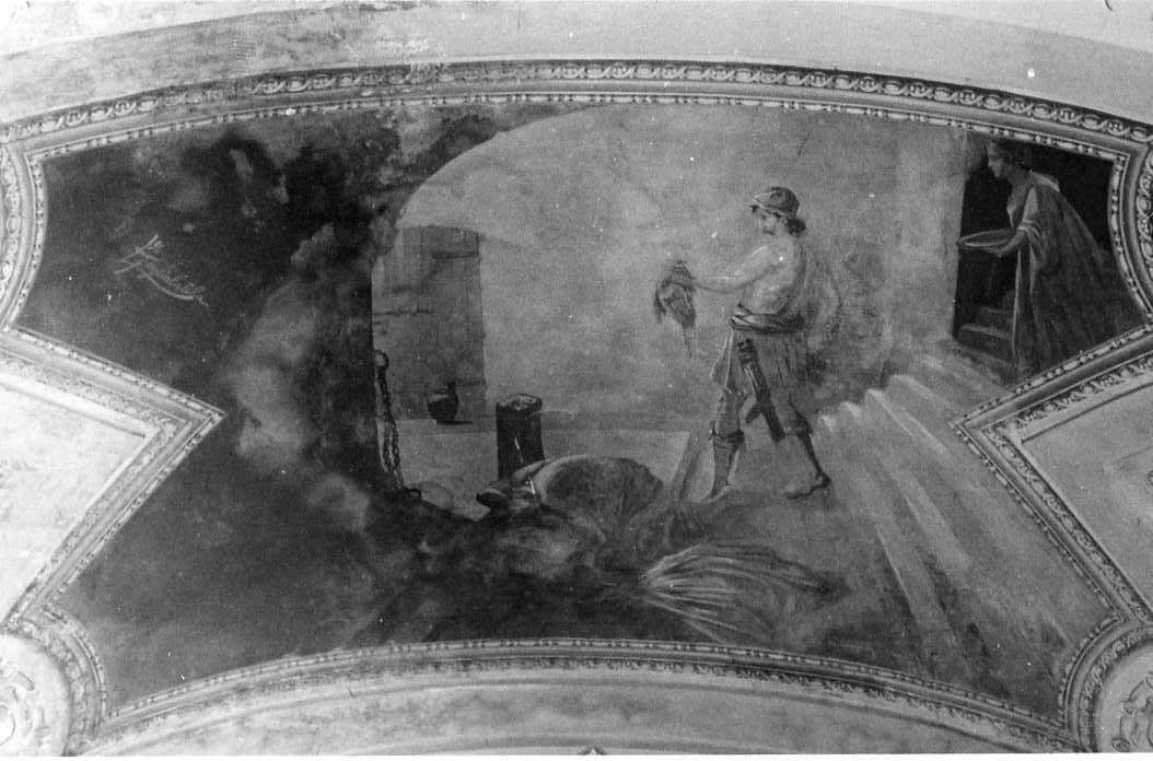 All'interno di una cella il corpo del Battista giace accanto al ceppo insanguinato, il boia a torso nudo stringe in mano la testa di A. Giovanni, mentre Salomè in cima alla scalinata porge il vassoio