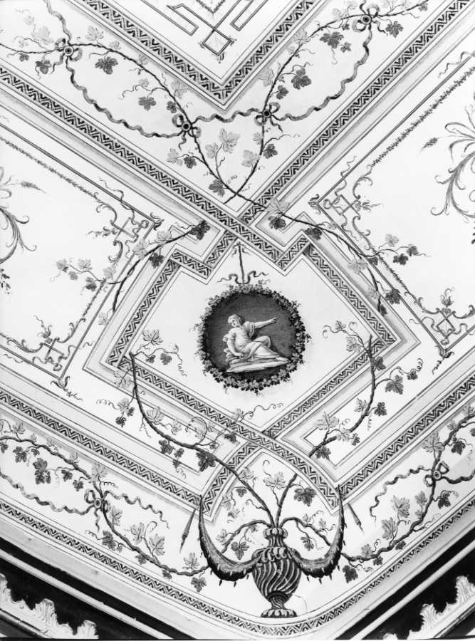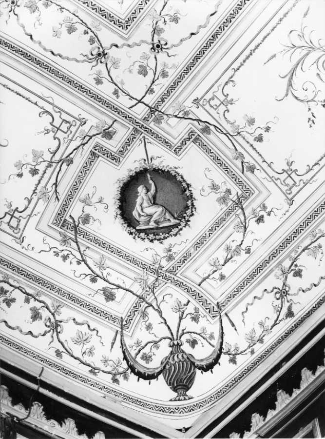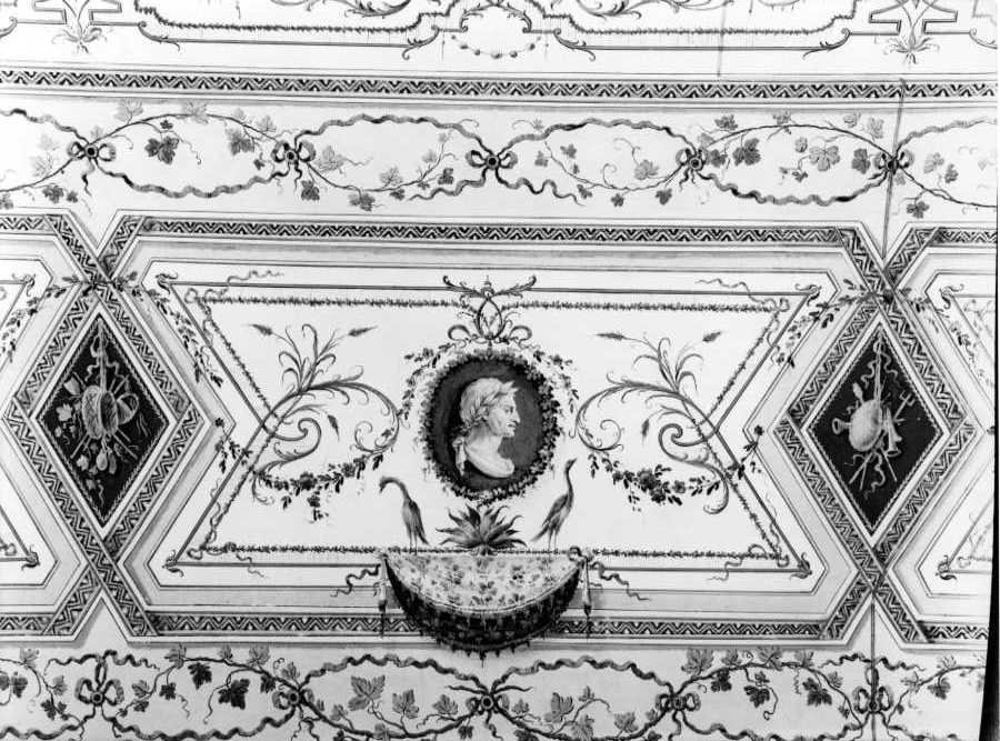 Tralci di fiori e foglie incorniciano le sei cornici romboidali, che si alternano ad altrettante cornici ovali, dipinte rispettivamente con trofei militari e figurine prelevate dal mondo classico. Al centro del soffitto, all'interno di un ovale dal fondo grigio, sono raffigurati due uomini, vicino ad una ara sacrificale