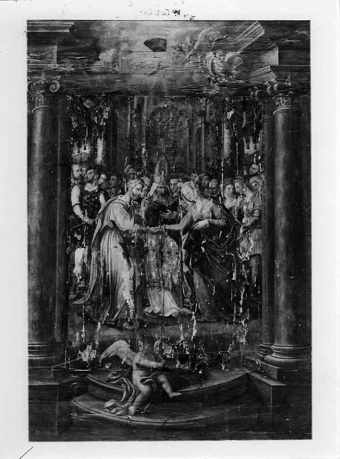 Dipinto con al centro la Madonna con veste rossa e manto blu e San Giuseppe con veste azzurra e manto giallo. Dietro di loro numerose figure sono assembrate sotto un porticato con archi laterali aperti sul paesaggio. Le colonne abbinate dipinte ai lati in primo piano, insieme all'angioletto in basso sui gradini, sono interventi settecenteschi