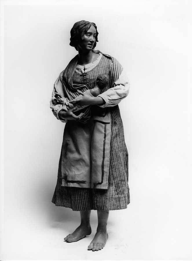Statuetta da presepio raffigurante una zingara a piedi nudi con testa policroma in terracotta, occhi in vetro, mani e piedi in legno, manichino in fil di ferro ricoperto di stoppa. Indossa una camicia in tela bianca, una veste in panno azzurro con righini chiari e corpetto allacciato, un grembiule in tela color viola con riquadro azzurro, scialle in tela colore marrone con righe bianche. Come accessorio tiene, tra le braccia, un bimbo in fascia, quest'ultimo fornito di solo testa