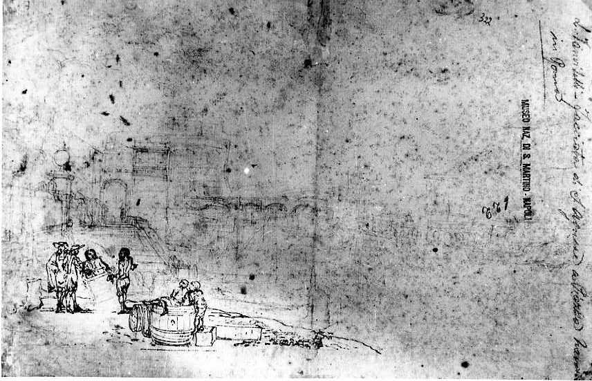 • NOTIZIE STORICO CRITICHE Il disegno,proveniente dalla collezione Masseangeli,rappresenta sul recto la sezione sinistra della facciata della chiesa di Sant'Agnese in Agone in Piazza Navona.E'presumibile che van Wittel,come nella maggior parte dei suoi disegni,anche in questo caso abbia utilizzato per l'esecuzione grafica uno strumento ottico quale la camera oscura.Ne sarebbe una conferma l'effetto sfumato dei punti estremi della rappresentazione,determinato dal limite del campo ottico della camera.Non vi sono tracce sul foglio del sistema di quadrettatura,usato come metodo di riporto dell'immagine,probabilmente perchè cancellato in un momento successivo.La minuzia descrittiva degli elementi architettonici,inoltre,sarebbe una testimonianza della precisazione dei particolari attraverso un'osservazione dal vero.Il disegno deve considerarsi una sorta di dettagliata annotazione grafica,utilizzata per la realizzazione del grande disegno preparatorio raffigurante piazza navona e conservato nella Biblioteca Nazionale di Roma.Van Wittel si servì più volte di questo studio preparatorio per l'esecuzione delle numerose vedute della piazza.Diversamente dallo studio grafico della facciata di Sant'Agnese,sia nel disegno preparatorio sia nelle vedute il punto di osservazione degli edifici presenti nella piazza viene leggermente corretto a favore di una maggiore frontalità.Sul verso del foglio è presente uno studio preparatorio di un aveduta del tevere.Sulla sinistra emerge il campanile di Santo Spirito e sullo sfondo Castel Sant'Angelo e Ponte Sant'Angelo.Sempre sul verso sono riprodotte alcune annotazioni riguardanti la fondazione della chiesa di San Giovanni dei Fiorentini,di cui è rappresentato il profilo