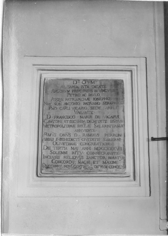- ISCRIZIONI D(---) O(---) M(---)/ ALTARIA ISTA DICATA/ APLORVM PRINCIPIBVS IN VINCVLIS/ PETRO, AC PAVLO, ATQVE PATRIARCHAE IOSEPHO/ NEC NON ANTONIO PADVANO SERAPHICO/ PMO CAPLI VICARIO, SEDE ARPLI/ VAGANTE./ D(---) FRANCISCO MARIA DE VICARYS,/ CANTORE, ET SECVNDA DIGNITATE HVIVS/ METROPOLITANAE ECCLAE SALERNITANAE/ ANNVENTE./ R(---)MVS D(---)NVS D(---) RAMIRVS PERRONI/ ABBAS S(---) BENEDICTI CIVITATIS SALERNI,/ OLIVETANAE CONGREGATIONIS./ DIE TERTIA MAY ANNI MDCCXXXVIII/ SOLEMNI RITV. CONSECRAVIT/ INCLVSIS RELIQVYS SANCTOR. MARTYR/ CONCORDY MAGNI ET MAXIMI/ QVOTANNIS INDVLGENTIA XL DIERVM CONCESSA - lettere capitali -