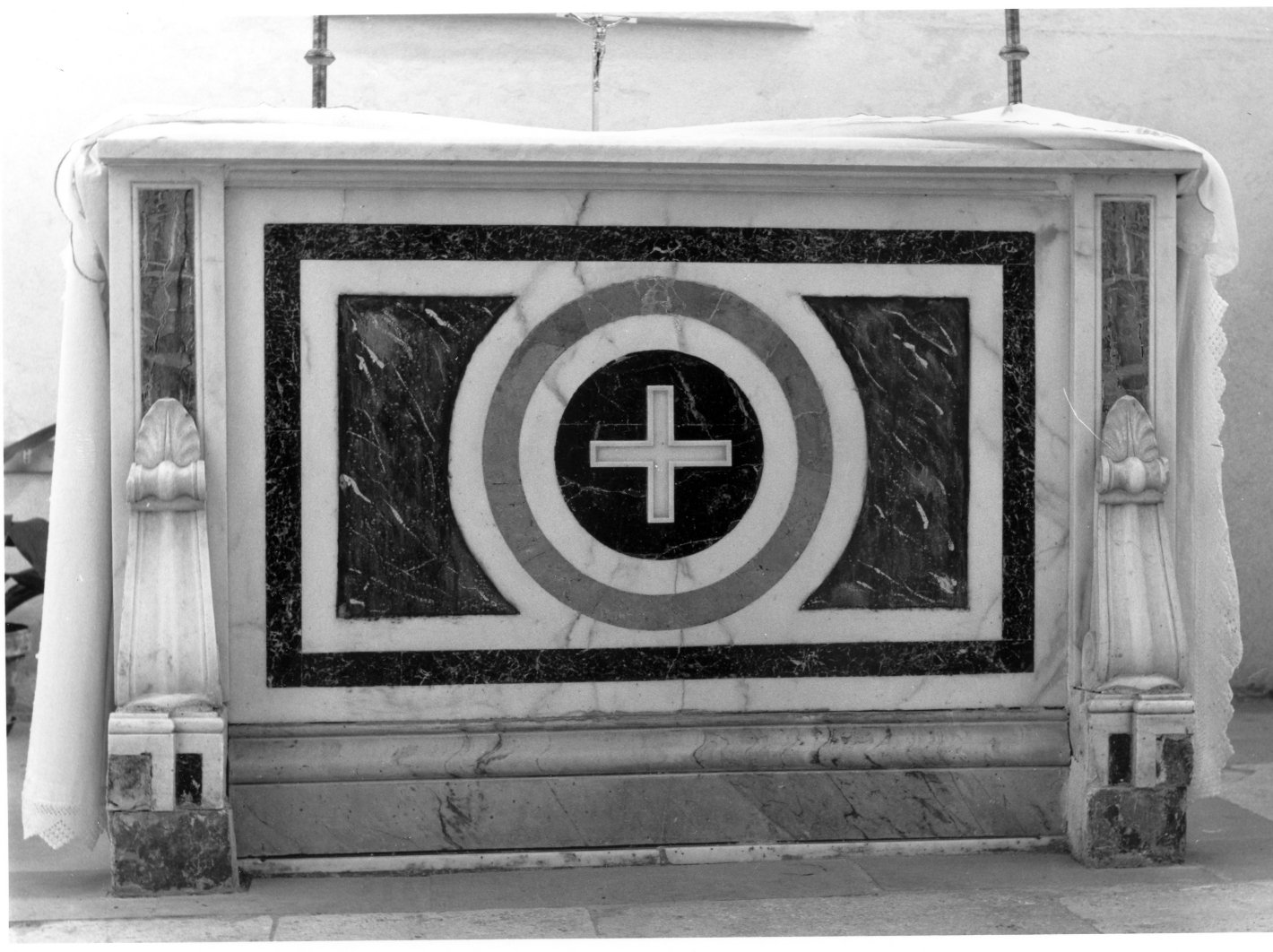 A forma di parallelepipedo rettangolo con paliotto a motivi geometrici in bianco e nero ed al centro croce bianca in rilievo su sfondo nero incorniciata a cerchi concentrici in bianco e marrone chiaro, il paliotto è affiancato da due pilastrini verde chiaro incorniciati in bianco ai quali, in baso sono applicate due volute in marmo bianco