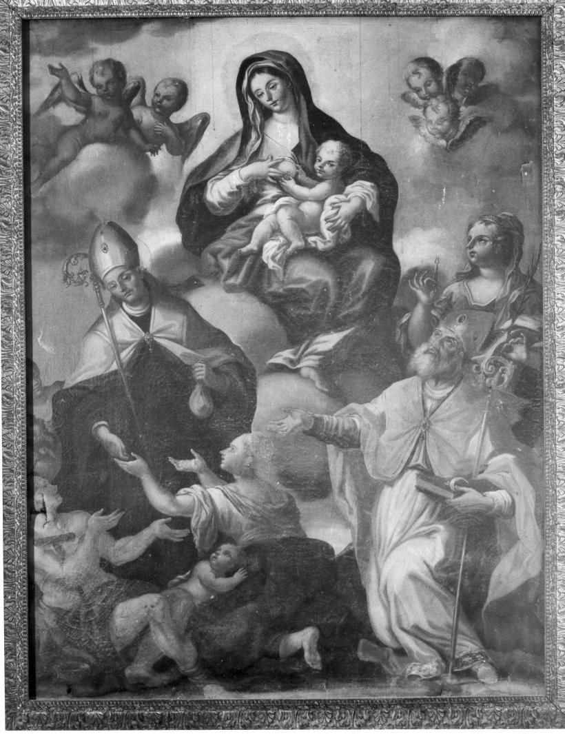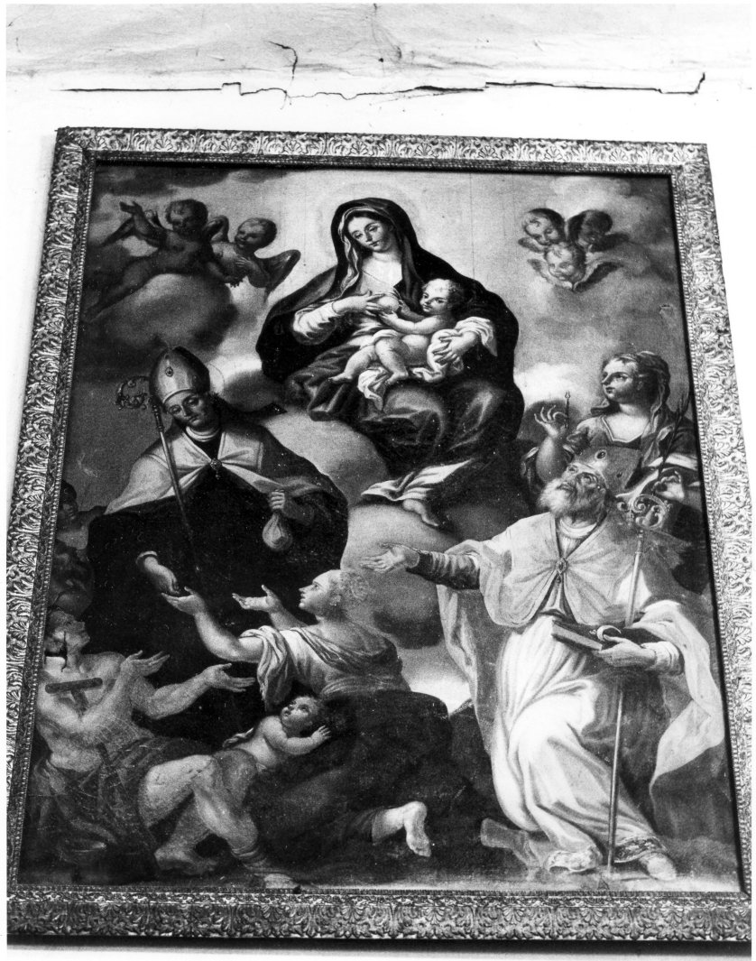 In alto la Vergine col Bambino. In basso da sinistra San Tommaso da Villanova è raffigurato mentre dona i suoi beni ai poveri, S. Apollonia con i simboli del martirio e S. Agostino in abito vescovile